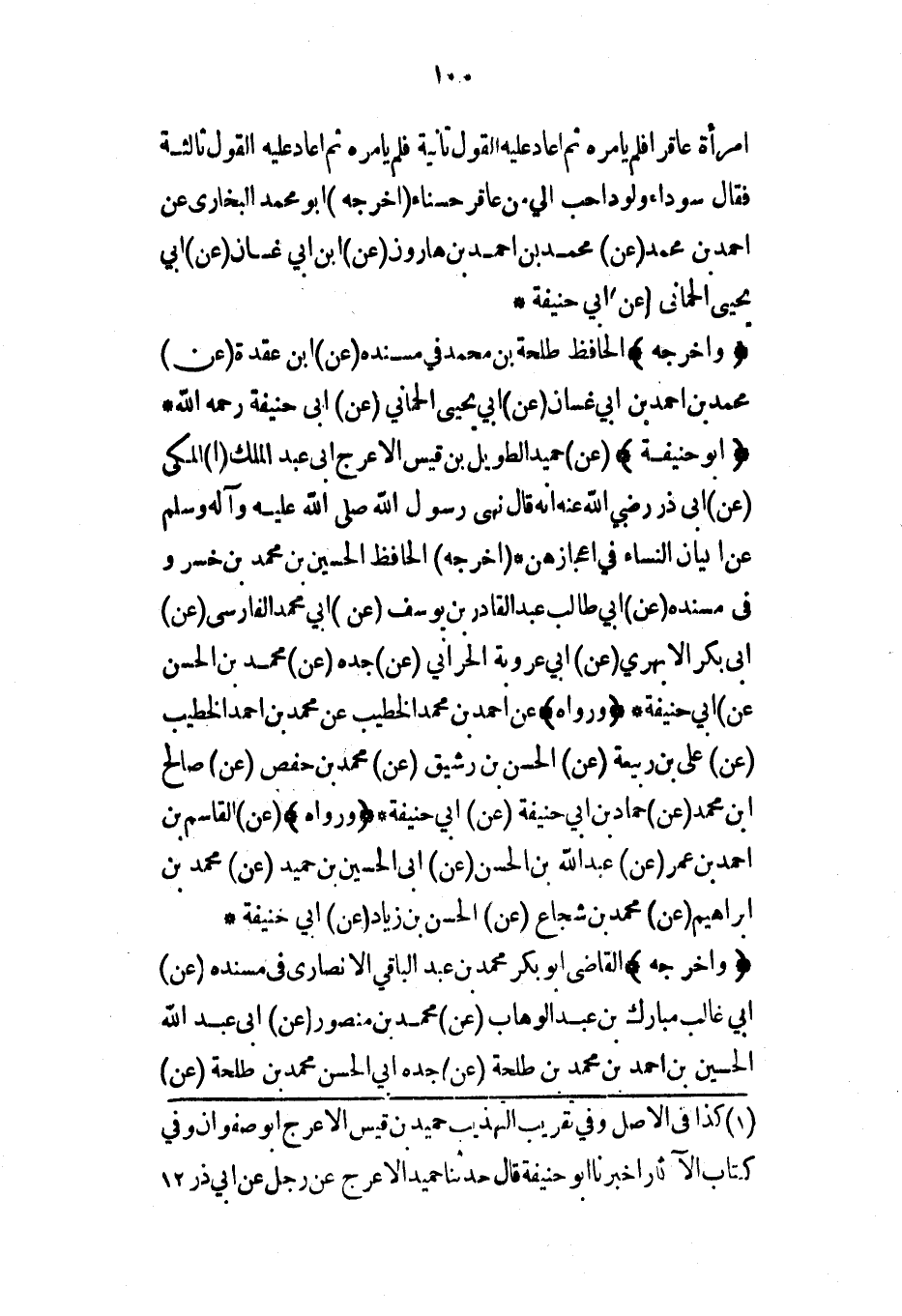 (أبو حنيفة) (عن) حميد الطويل بن قيس الأعرج أبي عبد الملك المكي (عن) أبي ذر رضي الله عنه أنه قال نهى رسول الله صلى الله عليه وآله وسلم عن إتيان النساء في أعجازهن* (أخرجه) الحافظ الحسين بن محمد بن خسرو في مسنده (عن) أبي طالب عبد القادر بن يوسف (عن) أبي محمد الفارسي (عن) أبي بكر الأبهري (عن) أبي عروبة الحراني (عن) جده (عن) محمد بن الحسن (عن) أبي حنيفة* (ورواه) عن أحمد بن محمد الخطيب عن محمد بن أحمد الخطيب (عن) علي بن ربيعة (عن) الحسن بن رشيق (عن) محمد بن حفص (عن) صالح ابن محمد (عن) حماد بن أبي حنيفة (عن) أبي حنيفة* (ورواه) (عن) القاسم بن أحمد بن عمر (عن) عبد الله بن الحسن (عن) أبي الحسين بن حميد (عن) محمد بن إبراهيم (عن) محمد بن شجاع (عن) الحسن بن زياد (عن) أبي حنيفة*