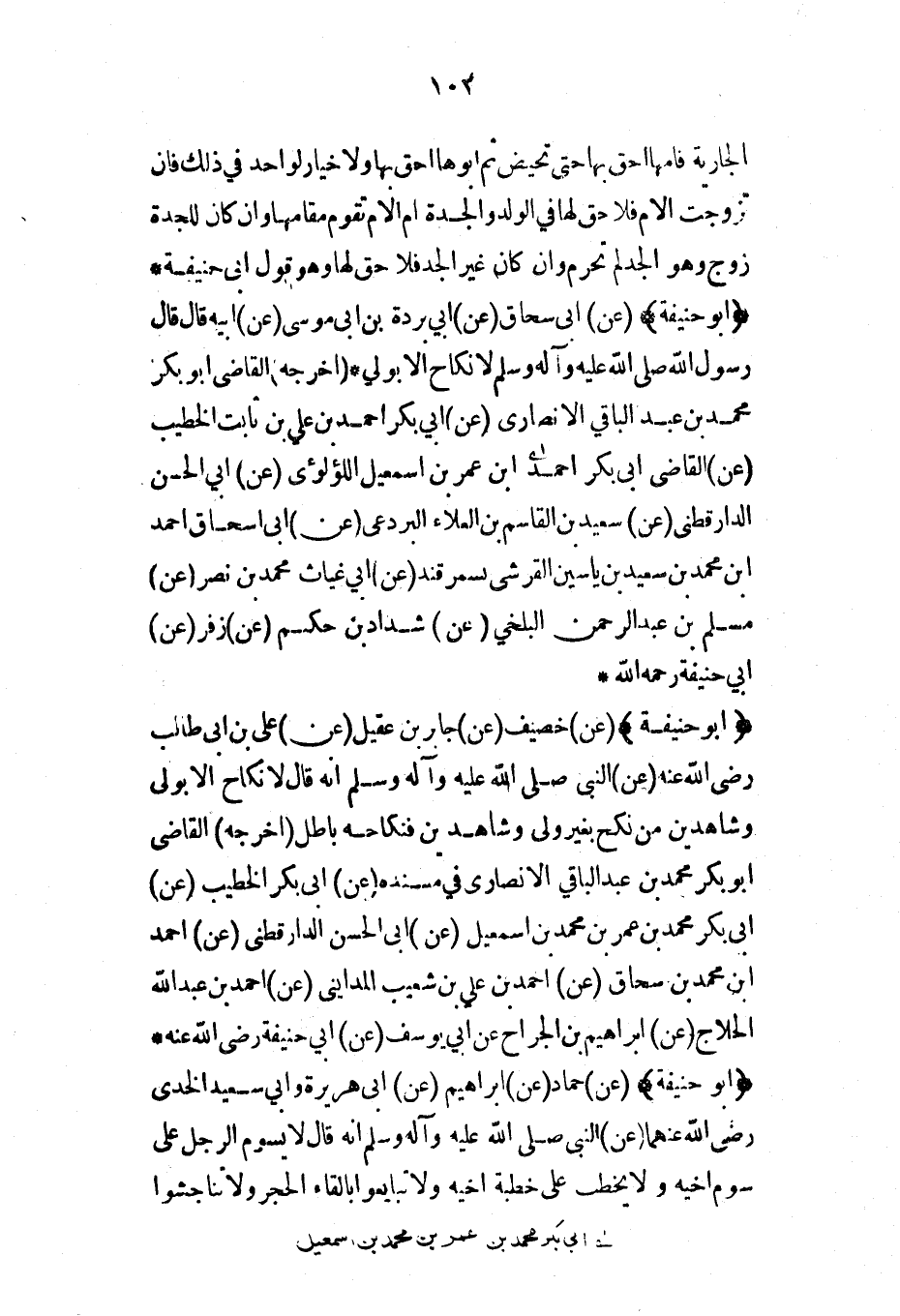 (أبو حنيفة) (عن) أبي إسحاق (عن) أبي بردة بن أبي موسى (عن) أبيه قال قال رسول الله صلى الله عليه وآله وسلم لا نكاح إلا بولي* (أخرجه) القاضي أبو بكر محمد بن عبد الباقي الأنصاري (عن) أبي بكر أحمد بن علي بن ثابت الخطيب (عن) القاضي أبي بكر أحمد ابن عمر بن إسماعيل اللؤلؤي (عن) أبي الحسن الدارقطني (عن) سعيد بن القاسم بن العلاء البردعي (عن) أبي إسحاق أحمد ابن محمد بن سعيد بن ياسين القرشي بسمرقند (عن) أبي غياث محمد بن نصر (عن) مسلم بن عبد الرحمن البلخي (عن) شداد بن حكم (عن) زفر (عن) أبي حنيفة رحمه الله*