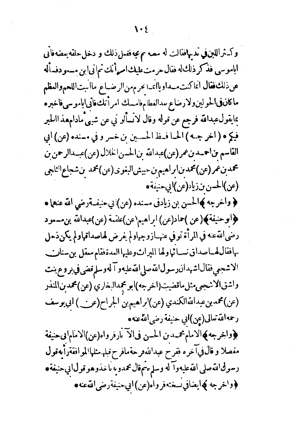 وكثر اللبن في ثديها فقالت له مصه ثم مجه ففعل ذلك ودخل حلقه بعضه فأتى أبا موسى فذكر ذلك له فقال حرمت عليك امرأتك ثم أتى ابن مسعود فسأله عن ذلك فقال إنما كنت مداوياً إنما يحرم من الرضاع ما أنبت اللحم والعظم ما كان في الحولين ولا رضاع بعد الفطام فأمسك امرأتك فأتى أبي موسى فأخبره بما يقول عبد الله فرجع عن قوله وقال لا تسألوني عن شيء ما دام هذا الحبر فيكم* (أخرجه) الحافظ الحسين بن خسرو في مسنده (عن) أبي القاسم بن أحمد بن عمر (عن) عبد الله بن الحسن الخلال (عن) عبد الرحمن بن محمد بن عمر (عن) محمد بن إبراهيم بن حبيش البغوي (عن) محمد بن شجاع الثلجي (عن) الحسن بن زياد (عن) أبي حنيفة*
