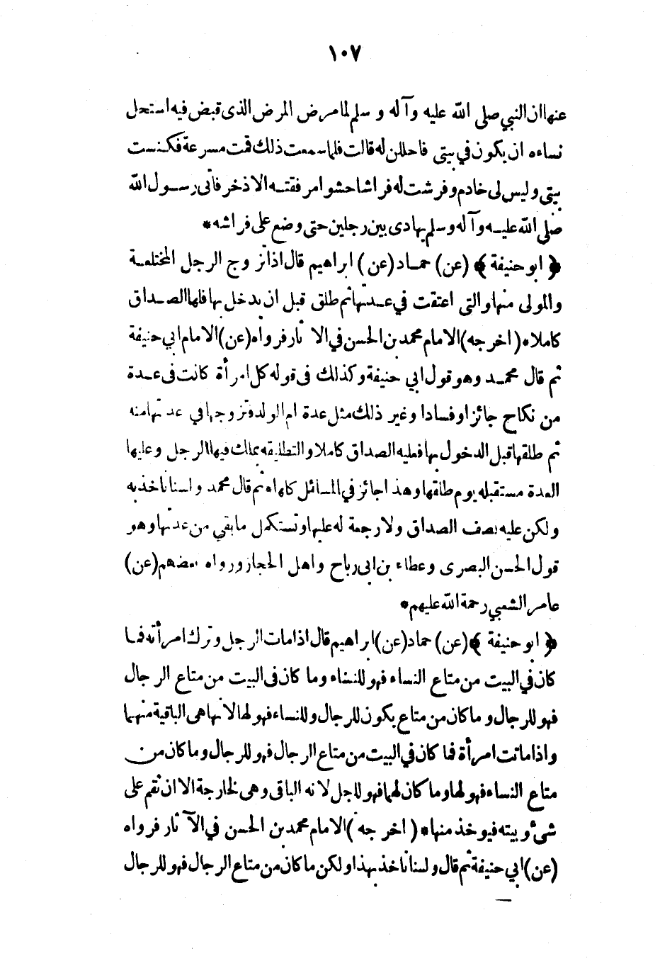 (أبو حنيفة) (عن) حماد (عن) إبراهيم قال إذا مات الرجل وترك امرأته فما كان في البيت من متاع النساء فهو للنساء وما كان في البيت من متاع الرجال فهو للرجال وما كان من متاع يكون للرجال وللنساء فهو لها لأنها هي الباقية منهما وإذا ماتت امرأة فما كان في البيت من متاع الرجال فهو للرجال وما كان من متاع النساء فهو لها وما كان لهما فهو للرجل لأنه الباقي وهي الخارجة إلا أن تقم على شيء وبيته فيؤخذ منها* (أخرجه) الإمام محمد بن الحسن في الآثار فرواه (عن) أبي حنيفة ثم قال ولسنا نأخذ بهذا ولكن ما كان من متاع الرجال فهو للرجال