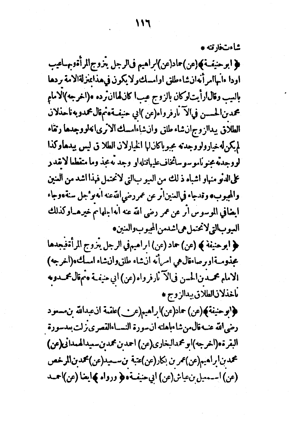 (أبو حنيفة) (عن) حماد (عن) إبراهيم في الرجل يتزوج المرأة فيجدها مجذومة أو برصاء قال هي امرأته إن شاء طلق وإن شاء أمسك* (أخرجه) الإمام محمد بن الحسن في الآثار فرواه (عن) أبي حنيفة* ثم قال محمد وبه نأخذ لأن الطلاق بيد الزوج*