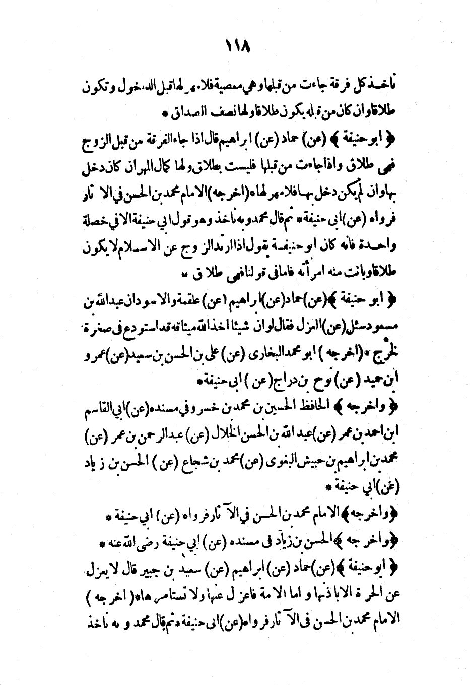 (أبو حنيفة) (عن) حماد (عن) إبراهيم (عن) علقمة والأسود أن عبد الله بن مسعود سئل (عن) العزل فقال لو أن شيئاً أخذ الله ميثاقه قد استودع في صخرة لخرج* (أخرجه) أبو محمد البخاري (عن) علي بن الحسن بن سعيد (عن) عمرو ابن حميد (عن) نوح بن دراج (عن) أبي حنيفة*