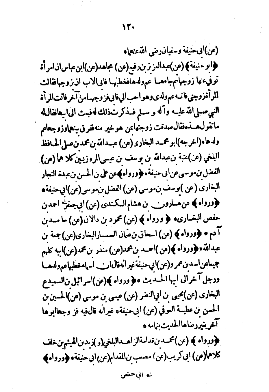 (أبو حنيفة) (عن) عبد العزيز بن رفيع (عن) مجاهد (عن) ابن عباس أن امرأة توفي عنها زوجها ثم جاءها عم ولدها فخطبها فأبى الأب أن يزوجها فقالت المرأة زوجني فإنه عم ولدي وهو أحب إلي فأبى فزوجها من آخر فأتت المرأة النبي صلى الله عليه وآله وسلم فذكرت ذلك له فبعث إلى أبيها فقال له ما تقول هذه فقال صدقت زوجتها بمن هو خير منه ففرق بينهما وزوجها عم ولدها* (أخرجه) أبو محمد البخاري (عن) عبد الله بن محمد بن علي الحافظ البلخي (عن) عتبة بن عبد الله بن يوسف بن عيسى المروزيين كلاهما (عن) الفضل بن موسى عن أبي حنيفة* (ورواه) عن علي بن الحسن بن عبدة النجار البخاري (عن) يوسف بن موسى (عن) الفضل بن موسى (عن) أبي حنيفة* (ورواه) عن هارون بن هشام الكندي (عن) أبي جعفر أحمد بن حفص البخاري* (ورواه) (عن) محمود بن دالان (عن) حامد بن آدم* (ورواه) (عن) إسحاق بن عثمان السمسار البخاري (عن) جمعة بن عبد الله* (ورواه) (عن) أحمد بن محمد (عن) منذر بن محمد (عن) أبيه كلهم جميعاً عن أسد بن عمرو (عن) أبي حنيفة غير أنه قال إن أسماء خطبها عم ولدها ورجل آخر إلى أبيها الحديث* (ورواه) (عن) إسرائيل بن السميدع البخاري (عن) يحيى بن أبي النضر (عن) عيسى بن موسى (عن) الحسين بن الحسن بن عطية العوفي (عن) أبي حنيفة* غير أنه قال فيه فزوجها أبوها آخر بغير رضاها الحديث بتمامه*