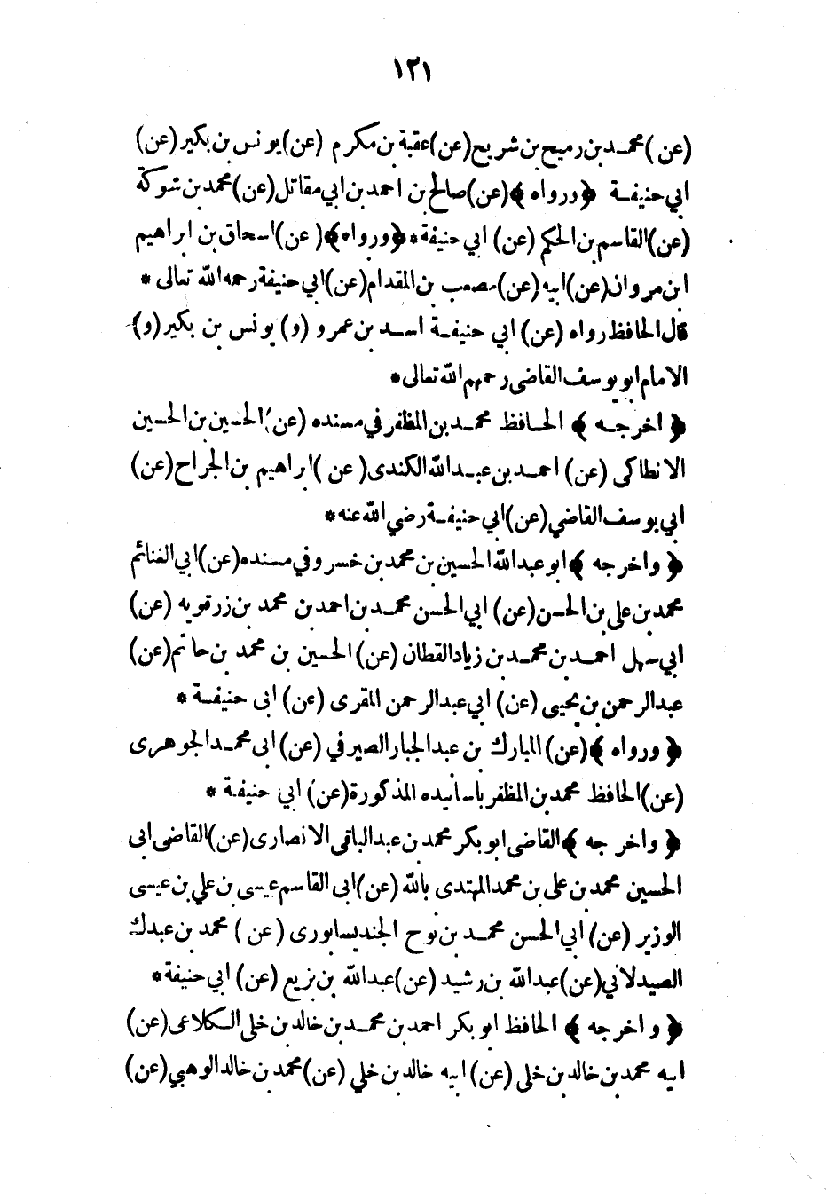 (عن) محمد بن رميح بن شريح (عن) عقبة بن مكرم (عن) يونس بن بكير (عن) أبي حنيفة (ورواه) (عن) صالح بن أحمد بن أبي مقاتل (عن) محمد بن شوكة (عن) القاسم بن الحكم (عن) أبي حنيفة* (ورواه) (عن) إسحاق بن إبراهيم ابن مروان (عن) أبيه (عن) مصعب بن المقدام (عن) أبي حنيفة رحمه الله تعالى* قال الحافظ رواه (عن) أبي حنيفة أسد بن عمرو (و) يونس بن بكير (و) الإمام أبو يوسف القاضي رحمهم الله تعالى*