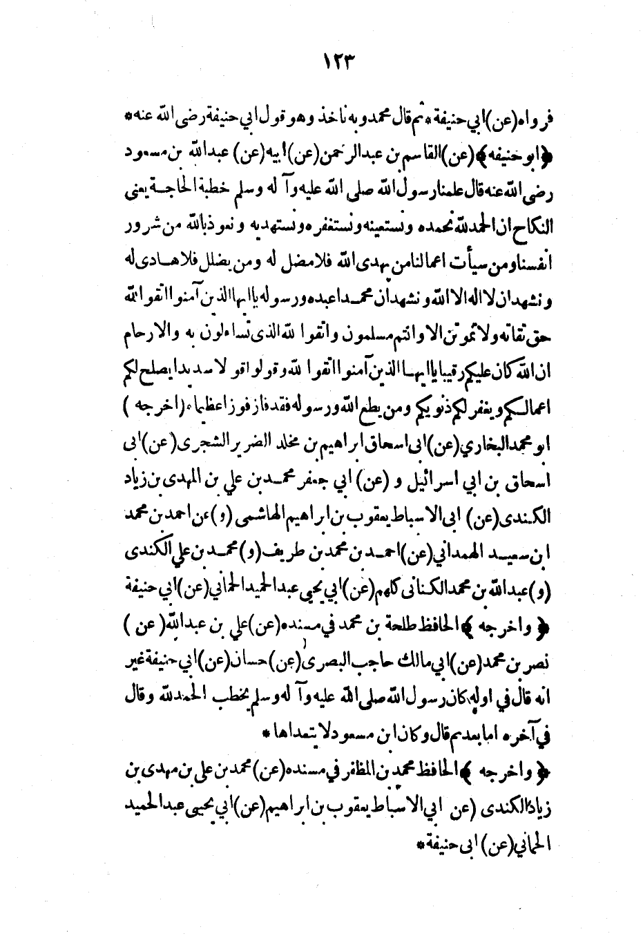 (أبو حنيفة) (عن) القاسم بن عبد الرحمن (عن) أبيه (عن) عبد الله بن مسعود رضي الله عنه قال علمنا رسول الله صلى الله عليه وآله وسلم خطبة الحاجة يعني النكاح إن الحمد لله نحمده ونستعينه ونستغفره ونستهديه ونعوذ بالله من شرور أنفسنا ومن سيئات أعمالنا من يهدي الله فلا مضل له ومن يضلل فلا هادي له ونشهد أن لا إله إلا الله ونشهد أن محمداً عبده ورسوله يا أيها الذين آمنوا اتقوا الله حق تقاته ولا تموتن إلا وأنتم مسلمون يا أيها الناس اتقوا ربكم الذي خلقكم من نفس واحدة وخلق منها زوجها وبث منهما رجالا كثيرا ونساء واتقوا الله الذي تساءلون به والأرحام إن الله كان عليكم رقيباً يا أيها الذين آمنوا اتقوا الله وقولوا قولاً سديداً يصلح لكم أعمالكم ويغفر لكم ذنوبكم ومن يطع الله ورسوله فقد فاز فوزاً عظيماً* (أخرجه) أبو محمد البخاري (عن) أبي إسحاق إبراهيم بن مخلد الضرير الشجري (عن) أبي إسحاق بن أبي إسرائيل و (عن) أبي جعفر محمد بن علي بن المهدي بن زياد الكندي (عن) أبي الأسباط يعقوب بن إبراهيم الهاشمي (و) عن أحمد بن محمد ابن سعيد الهمداني (عن) أحمد بن محمد بن طريف (و) محمد بن علي الكندي (و) عبد الله بن محمد الكناني كلهم (عن) أبي يحيى عبد الحميد الحماني (عن) أبي حنيفة (وأخرجه) الحافظ طلحة بن محمد في مسنده (عن) علي بن عبد الله (عن) نصر بن محمد (عن) أبي مالك حاجب البصري (عن) حسان (عن) أبي حنيفة غير أنه قال في أوله كان رسول الله صلى الله عليه وآله وسلم يخطب الحمد لله وقال في آخره أما بعد ثم قال وكان ابن مسعود لا يتعداها*