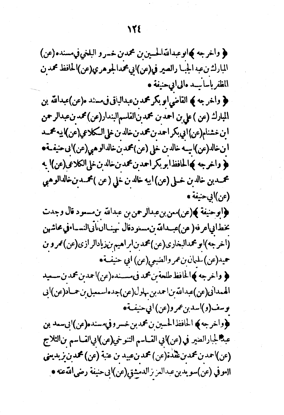 (أبو حنيفة) (عن) معن بن عبد الرحمن بن عبد الله بن مسعود قال وجدت بخط أبي أعرفه (عن) عبد الله بن مسعود قال نهينا أن نأتي النساء في محاشهن (أخرجه) أبو محمد البخاري (عن) محمد بن إبراهيم بن زياد الرازي (عن) عمرو بن حميد (عن) سليمان بن عمرو الضبعي (عن) أبي حنيفة*