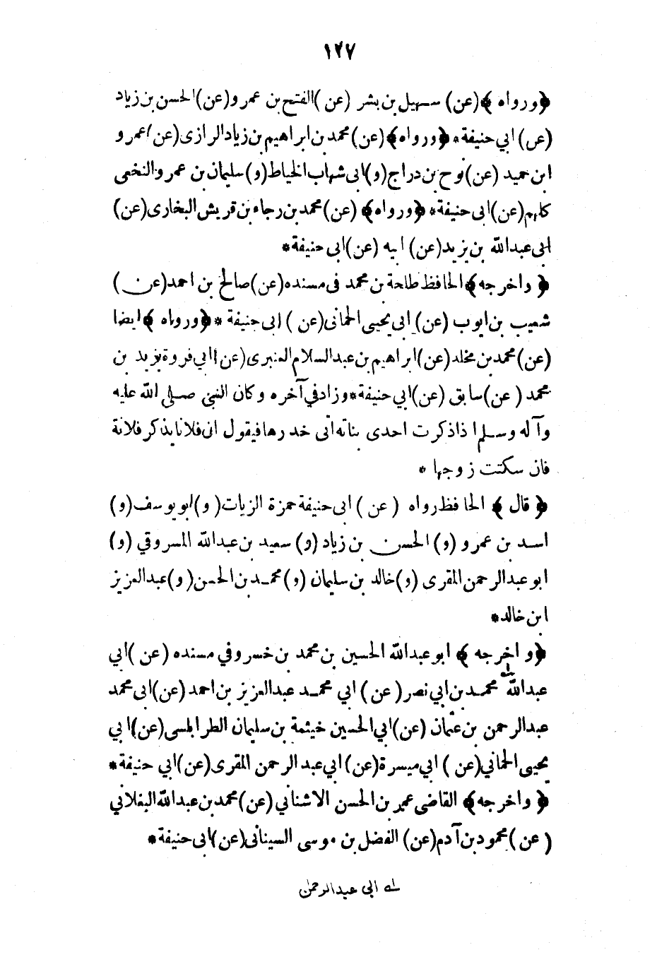 (ورواه) (عن) سهيل بن بشر (عن) الفتح بن عمرو (عن) الحسن بن زياد (عن) أبي حنيفة* (ورواه) (عن) محمد بن إبراهيم بن زياد الرازي (عن) عمرو ابن حميد (عن) نوح بن دراج (و) أبي شهاب الخياط (و) سليمان بن عمرو النخعي كلهم (عن) أبي حنيفة* (ورواه) (عن) محمد بن رجاء بن قريش البخاري (عن) أبي عبد اله بن يزيد (عن) أبيه (عن) أبي حنيفة*