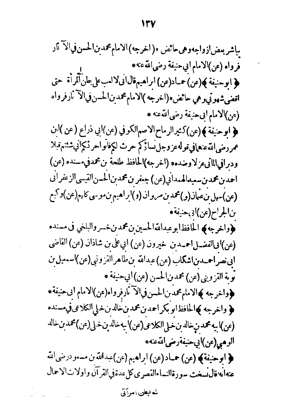 (أبو حنيفة) (عن) حماد (عن) إبراهيم قال إني لألعب على بطن المرأة حتى أقضي شهوتي وهي حائض* (أخرجه) الإمام محمد بن الحسن في الآثار فرواه (عن) الإمام أبي حنيفة رضي الله عنه*