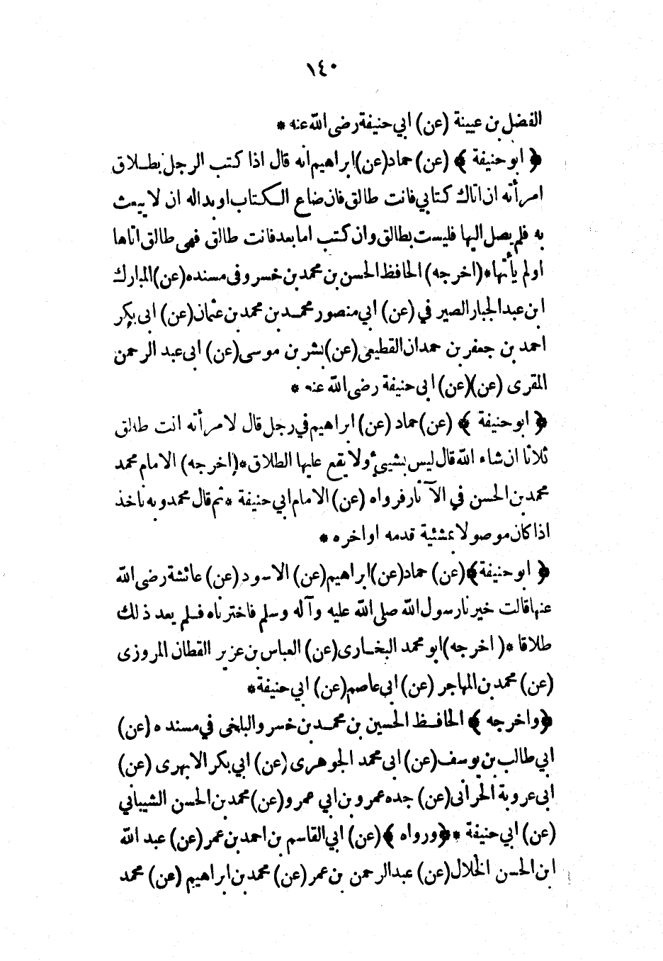(أبو حنيفة) (عن) حماد (عن) إبراهيم (عن) الأسود (عن) عائشة رضي الله عنها قالت خيرنا رسول الله صلى الله عليه وآله وسلم فاخترناه فلم يعد ذلك طلاقاً* (أخرجه) أبو محمد البخاري (عن) العباس بن عزير القطان المروزي (عن) محمد بن المهاجر (عن) أبي عاصم (عن) أبي حنيفة*