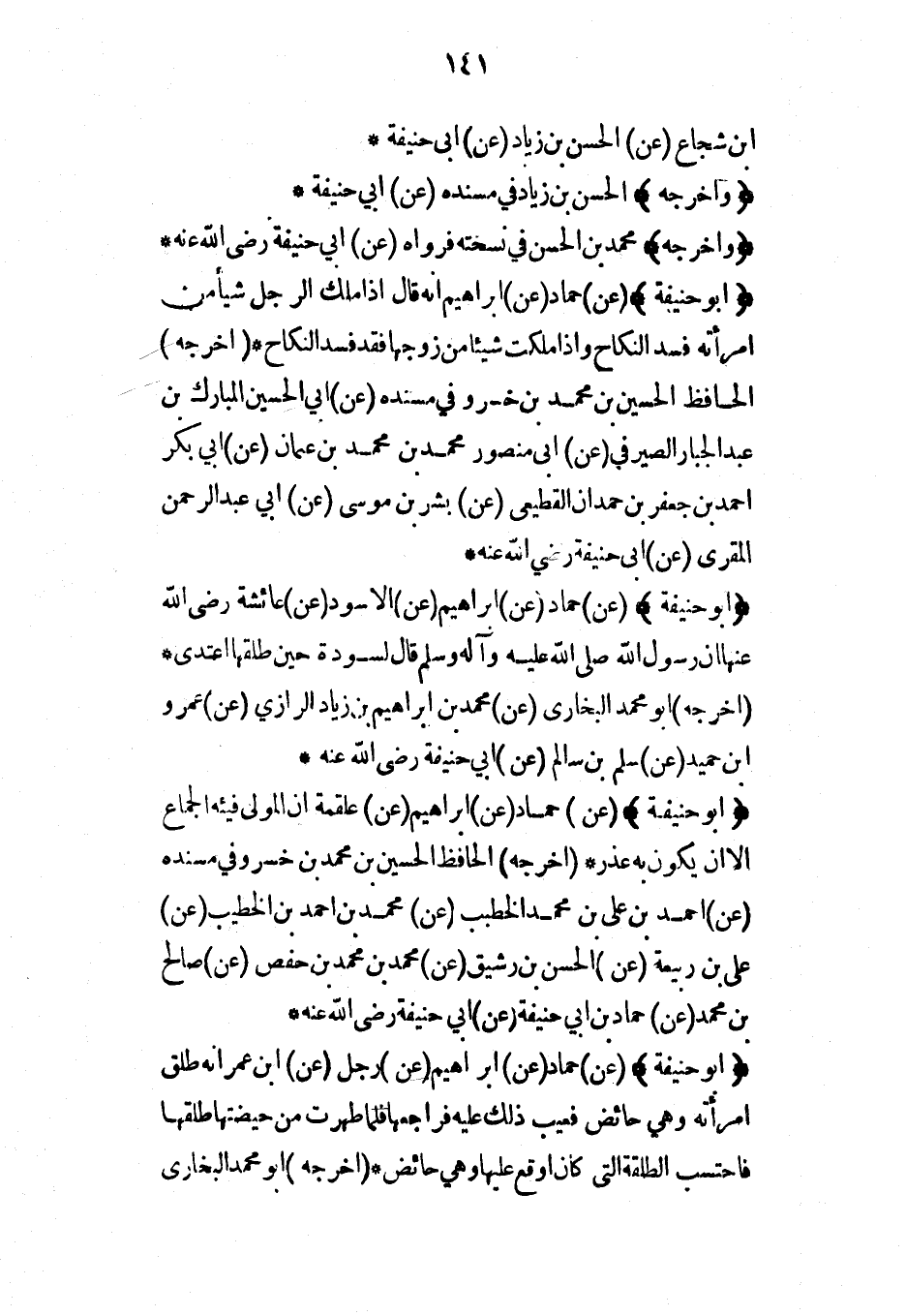 (أبو حنيفة) (عن) حماد (عن) إبراهيم (عن) الأسود (عن) عائشة رضي الله عنها أن رسول الله صلى الله عليه وآله وسلم قال لسودة حين طلقها اعتدي* (أخرجه) أبو محمد البخاري (عن) محمد بن إبراهيم بن زياد الرازي (عن) عمرو ابن حميد (عن) سلم بن سالم (عن) أبي حنيفة رضي الله عنه*