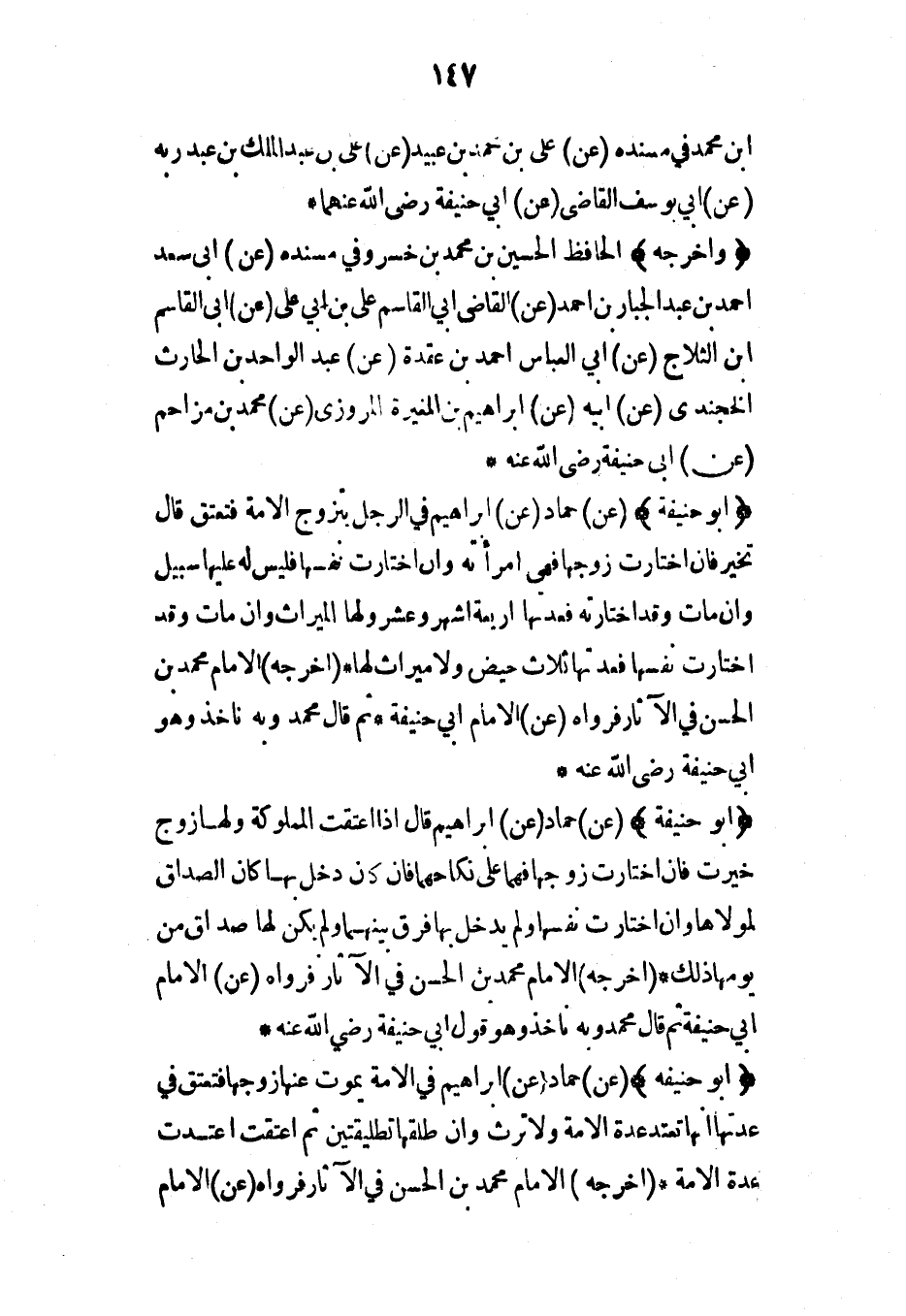 ابن محمد في مسنده (عن) علي بن محمد بن عبيد (عن) علي بن عبد الملك بن عبد ربه (عن) أبي يوسف القاضي (عن) أبي حنيفة رضي الله عنهما*