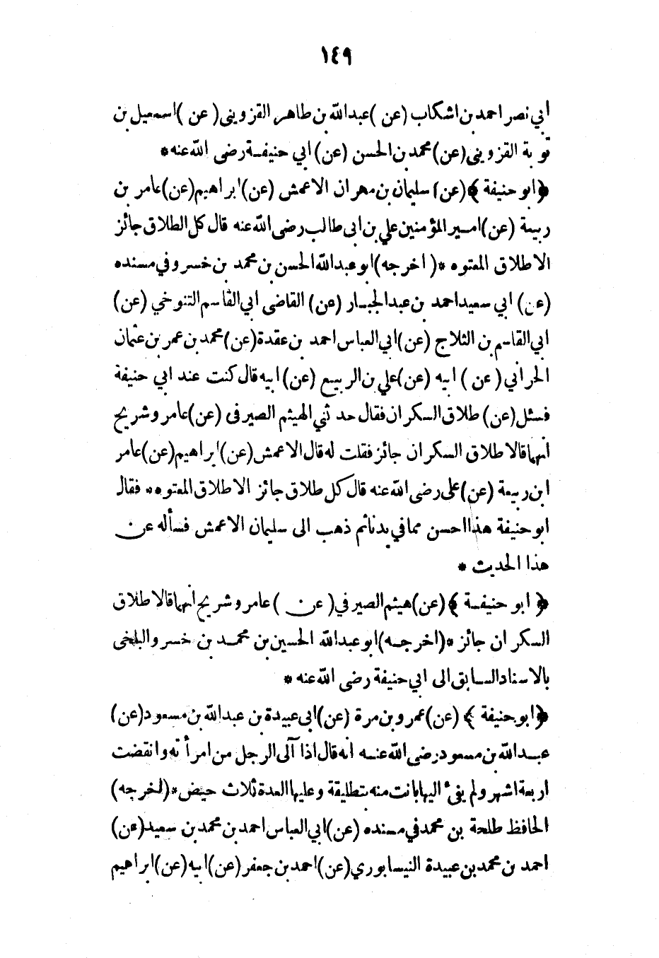 (أبو حنيفة) (عن) سليمان بن مهران الأعمش (عن) إبراهيم (عن) عامر بن ربيعة (عن) أمير المؤمنين علي بن أبي طالب رضي الله عنه قال كل الطلاق جائز إلا طلاق المعتوه* (أخرجه) أبو عبد الله الحسن بن محمد بن خسرو في مسنده (عن) أبي سعيد أحمد بن عبد الجبار (عن) القاضي أبي القاسم التنوخي (عن) أبي القاسم بن الثلاج (عن) أبي العباس أحمد بن عقدة (عن) محمد بن عمر بن عثمان الحراني (عن) أبيه (عن) علي بن الربيع (عن) أبيه قال كنت عند أبي حنيفة فسئل (عن) طلاق السكران فقال حدثني الهيثم الصيرفي (عن) عامر وشريح أنهما قالا طلاق السكران جائز فقلت له قال الأعمش (عن) إبراهيم (عن) عامر ابن ربيعة (عن) علي رضي الله عنه قال كل طلاق جائز إلا طلاق المعتوه* فقال أبو حنيفة هذا أحسن مما في يدنا ثم ذهب إلى سليمان الأعمش فسأله عن هذا الحديث*