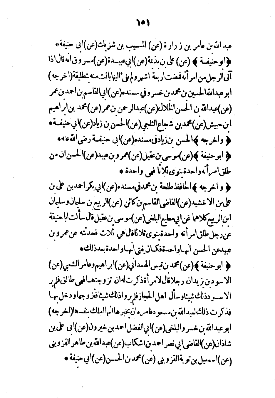 (أبو حنيفة) (عن) محمد بن قيس الهمداني (عن) إبراهيم وعامر الشعبي (عن) الأسود بن يزيد أن رجلاً قال لامرأة ذكرت له أن تزوجتها فهي طالق فلم ير الأسود ذلك شيئاً وسأل أهل الحجاز فلم يروا ذلك شيئاً فتزوجها ودخل بها فذكرت ذلك لعبد الله بن مسعود فأمره أن يخبرها أنها أملك بنفسها (أخرجه) أبو عبد الله بن خسرو البلخي (عن) أبي الفضل أحمد بن خيرون (عن) أبي علي بن شاذان (عن) القاضي أبي نصر أحمد بن اشكاب (عن) عبد الله بن طاهر القزويني (عن) إسماعيل بن توبة القزويني (عن) محمد بن الحسن (عن) أبي حنيفة*