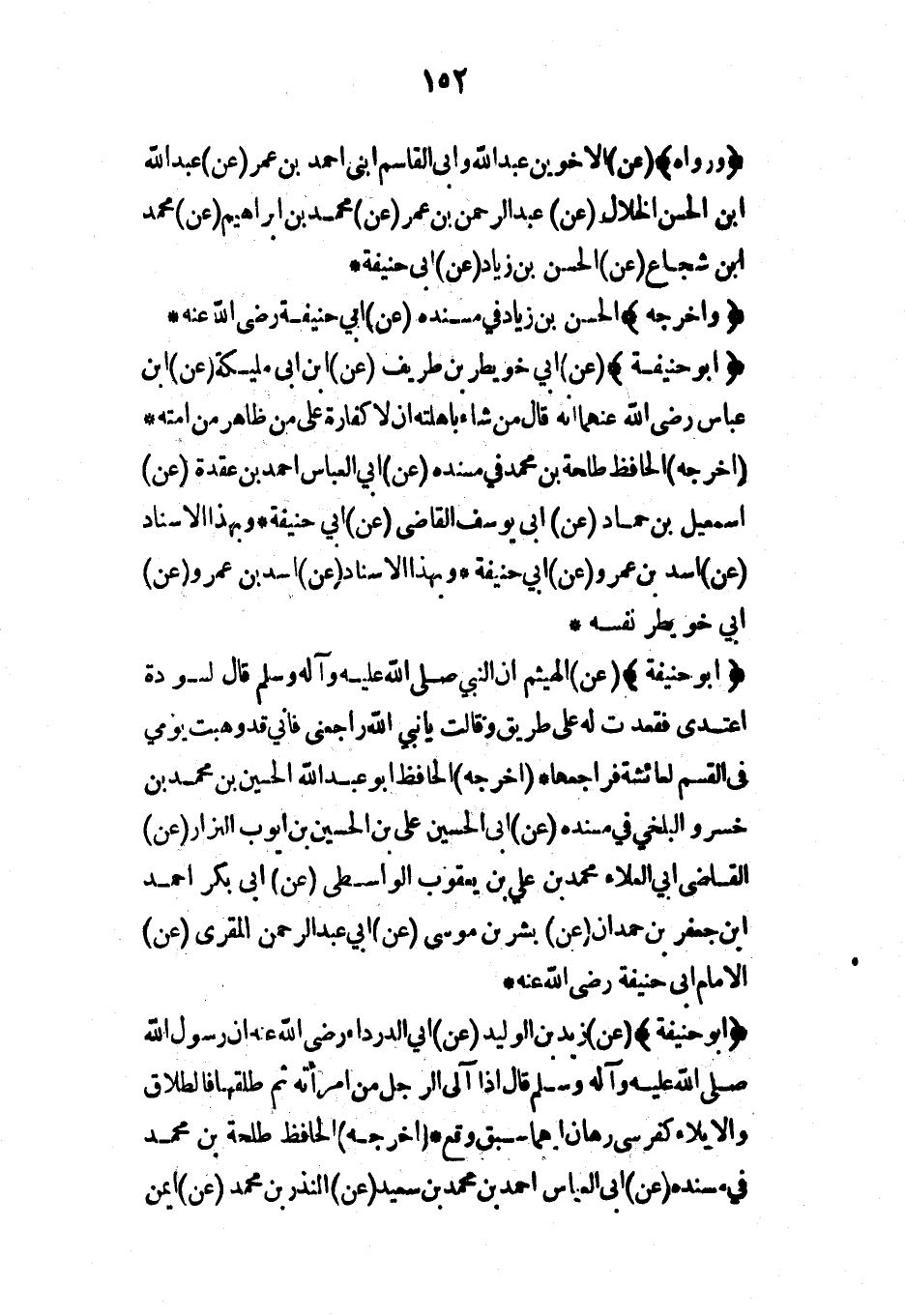 (ورواه) (عن) الأخوين عبد الله وأبي القاسم ابني أحمد بن عمر (عن) عبد الله ابن الحسن الخلال (عن) عبد الرحمن بن عمر (عن) محمد بن إبراهيم (عن) محمد ابن شجاع (عن) الحسن بن زياد (عن) أبي حنيفة*