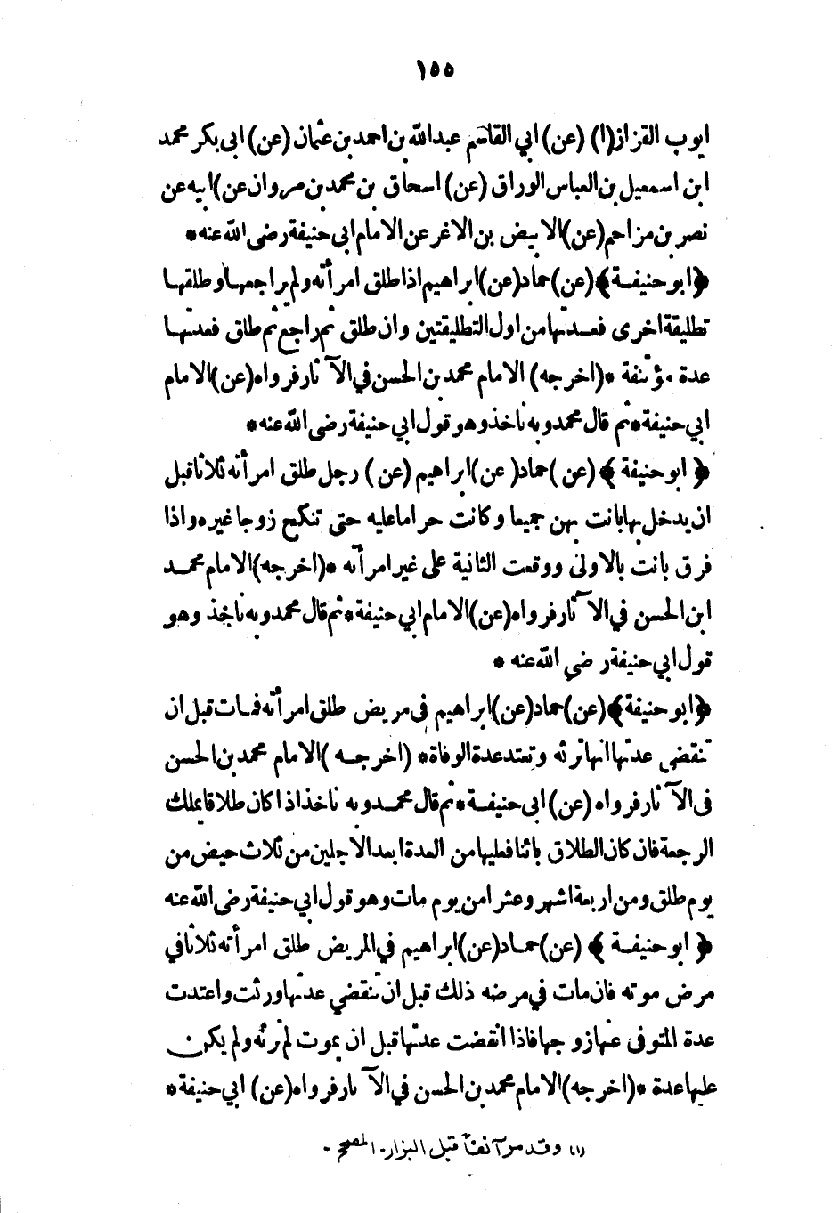 (أبو حنيفة) (عن) حماد (عن) إبراهيم في مريض طلق امرأته فمات قبل أن تنقضي عدتها أنها ترثه وتعتد عدة الوفاة* (أخرجه) الإمام محمد بن الحسن في الآثار فرواه (عن) أبي حنيفة* ثم قال محمد وبه نأخذ إذا كان طلاقاً يملك الرجعة فإن كان الطلاق بائناً فعليها من المدة بعد الأجلين من ثلاث حيض من يوم طلق ومن أربعة أشهر وعشراً من يوم مات وهو قول أبي حنيفة رضي الله عنه (أبو حنيفة) (عن) حماد (عن) إبراهيم في المريض طلق امرأته ثلاثاً في مرض موته فإن مات في مرضه ذلك قبل أن تنقضي عدتها ورثت واعتدت عدة المتوفى عنها زوجها فإذا انقضت عدتها قبل أن يموت لم ترثه ولم يكن عليها عدة* (أخرجه) الإمام محمد بن الحسن في الآثار فرواه (عن) أبي حنيفة*