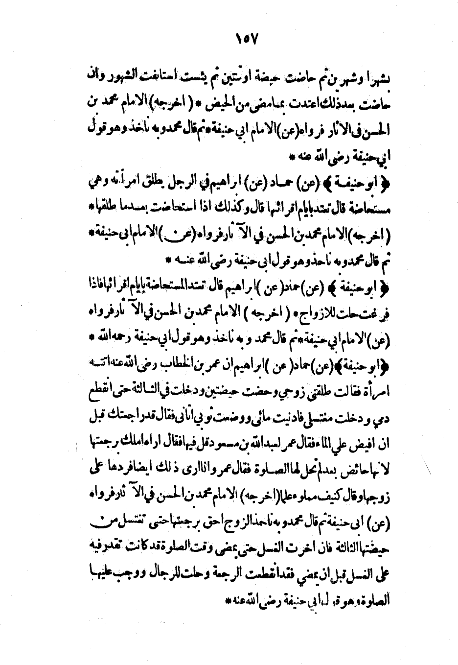 (أبو حنيفة) (عن) حماد (عن) إبراهيم أن عمر بن الخطاب رضي الله عنه أتته امرأة فقالت طلقني زوجي وحضت حيضتين ودخلت في الثالثة حتى انقطع دمي ودخلت مغتسلي فأدنيت مائي ووضعت ثوبي أتاني فقال قد راجعتك قبل أن أفيض علي الماء فقال عمر لعبد الله بن مسعود قل فيها فقال أراه أملك برجعتها لأنها حائض بعد لم تحل لها الصلاة فقال عمر وأنا أرى ذلك أيضاً فردها على زوجها وقال كنيف مملوء علماً (أخرجه) الإمام محمد بن الحسن في الآثار فرواه (عن) أبي حنيفة ثم قال محمد وبه نأخذ الزوج أحق برجعتها حتى تغتسل من حيضتها الثالثة فإن أخرت الغسل حتى يمضي وقت الصلاة قد كانت تقدر فيه على الغسل قبل أن يمضي فقد انقطعت الرجعة وحلت للرجال ووجب عليها الصلاة وهو قول أبي حنيفة رضي الله عنه*