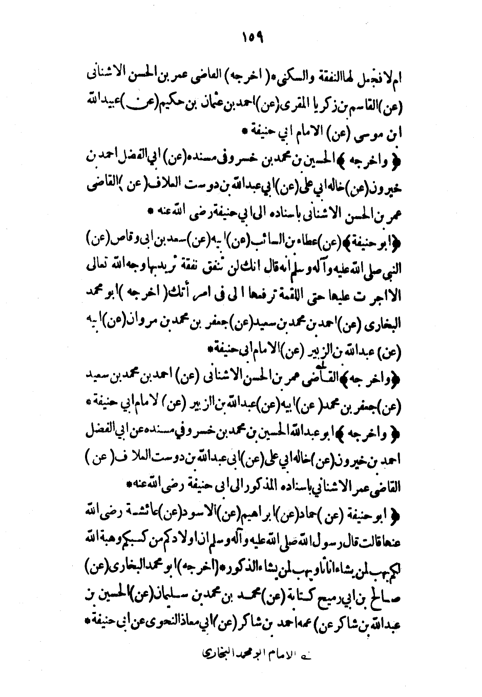 (أبو حنيفة) (عن) عطاء بن السائب (عن) أبيه (عن) سعد بن أبي وقاص (عن) النبي صلى الله عليه وآله وسلم أنه قال إنك لن تنفق نفقة تريد بها وجه الله تعالى إلا أجرت عليها حتى اللقمة ترفعها إلى في امرأتك (أخرجه) أبو محمد البخاري (عن) أحمد بن محمد بن سعيد (عن) جعفر بن محمد بن مروان (عن) أبيه (عن) عبد الله بن الزبير (عن) الإمام أبي حنيفة*