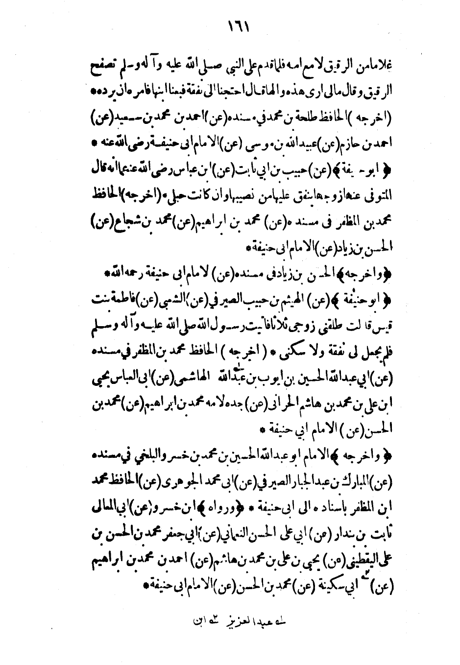 (أبو حنيفة) (عن) الهيثم بن حبيب الصيرفي (عن) الشعبي (عن) فاطمة بنت قيس قالت طلقني زوجي ثلاثاً فأتيت رسول الله صلى الله عليه وآله وسلم فلم يجعل لي نفقة ولا سكنى* (أخرجه) الحافظ محمد بن المظفر في مسنده (عن) أبي عبد الله الحسين بن أيوب بن عبد الله الهاشمي (عن) أبي العباس يحيى ابن علي بن محمد بن هاشم الحراني (عن) جده لأمه محمد بن إبراهيم (عن) محمد بن الحسن (عن) الإمام أبي حنيفة*