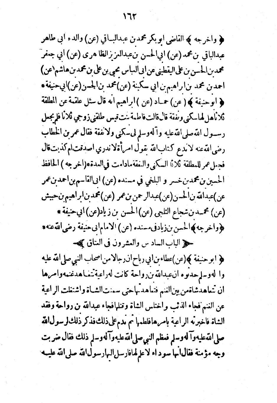 (وأخرجه) القاضي أبو بكر محمد بن عبد الباقي (عن) والده أبي طاهر عبد الباقي بن محمد (عن) أبي الحسن بن عبد العزيز الظاهري (عن) أبي جعفر محمد بن الحسن بن علي اليقطيني عن أبي العباس يحيى بن علي بن محمد بن هاشم (عن) أحمد بن محمد بن إبراهيم بن أبي سكينة (عن) محمد بن الحسن (عن) أبي حنيفة*