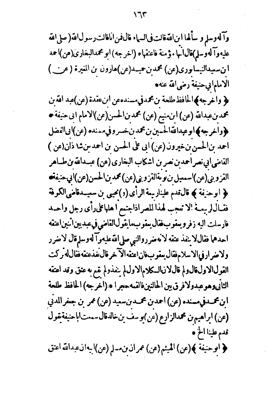(وأخرجه) الحافظ طلحة بن محمد في مسنده عن ابن عقدة (عن) عبد الله بن محمد بن عبد الله (عن) ابن منيع (عن) محمد بن الحسن (عن) الإمام أبي حنيفة* (وأخرجه) أبو عبد الله الحسين بن محمد بن خسرو في مسنده (عن) أبي الفضل أحمد بن الحسن بن خيرون (عن) أبي علي الحسن بن أحمد بن شاذان (عن) القاضي أبي نصر أحمد بن نصر بن اشكاب البخاري (عن) عبد الله بن طاهر القزويني (عن) إسماعيل بن توبة القزويني (عن) محمد بن الحسن (عن) أبي حنيفة* (أبو حنيفة) قال قدم علينا ربيعة الرأي (و) يحيى بن سعيد قاضي الكوفة فقال لربيعة ألا تعجب لهذا المصر إذا اجتمع أهلها على رأي رجل واحد فأرسلت إليه زفر ويعقوب فقال يعقوب ما يقول القاضي في عبد بين اثنين أعتقه أحدهما فقال لا ينفذ عتقه لأنه ضرر والنبي صلى الله عليه وآله وسلم قال لا ضرر ولا ضرار في الإسلام فقال يعقوب فإن أعتقه الآخر قال نفذ عتقه فقال له تركت القول الأول قال ولم قال لأن الكلام الأول لم ينفذ ولم يقع به عتق وقد أعتقه الثاني وهو عبد ولا فرق بين الحالتين فألقمه حجراً* (أخرجه) الحافظ طلحة ابن محمد في مسنده (عن) أحمد بن محمد بن سعيد (عن) عمر بن جعفر المدني (عن) إبراهيم بن محمد الزارع (عن) يوسف بن خالد قال سمعت أبا حنيفة يقول قدم علينا الخ*