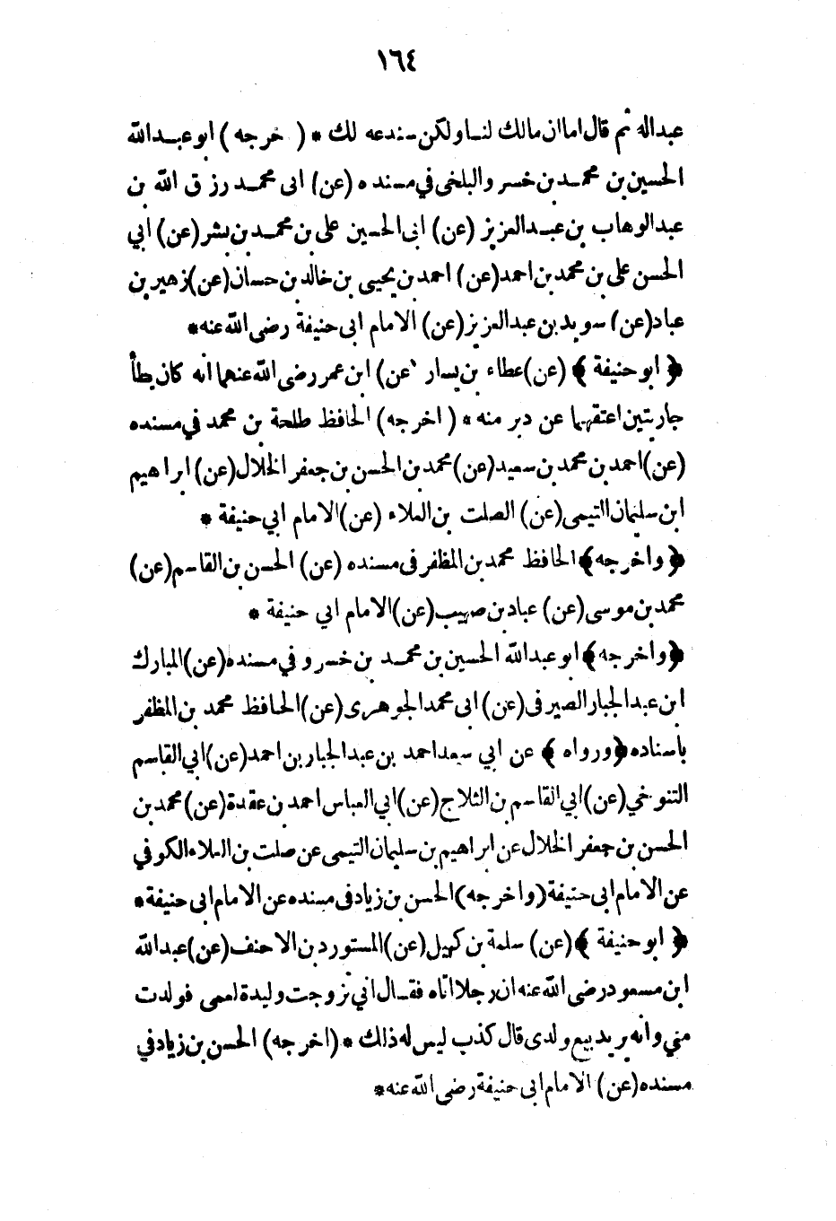 (وأخرجه) أبو عبد الله الحسين بن محمد بن خسرو في مسنده (عن) المبارك ابن عبد الجبار الصيرفي (عن) أبي محمد الجوهري (عن) الحافظ محمد بن المظفر بإسناده (ورواه) عن أبي سعيد أحمد بن عبد الجبار بن أحمد (عن) أبي القاسم التنوخي (عن) أبي القاسم بن الثلاج (عن) أبي العباس أحمد بن عقدة (عن) محمد بن الحسن بن جعفر الخلال عن إبراهيم بن سليمان التيمي عن صلت بن العلاء الكوفي عن الإمام أبي حنيفة (وأخرجه) الحسن بن زياد في مسنده عن الإمام أبي حنيفة*