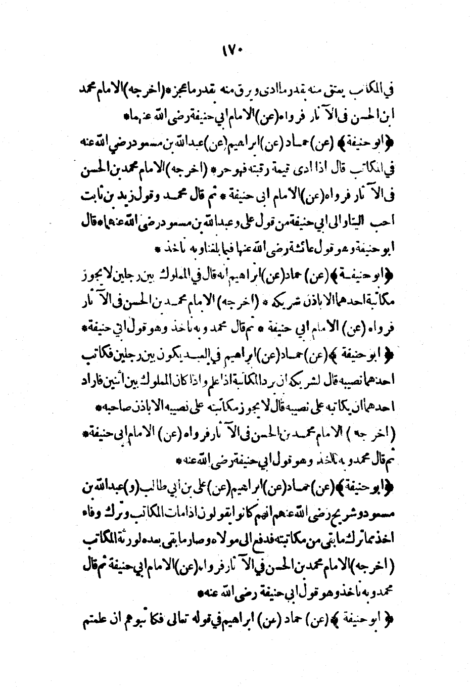 (أبو حنيفة) (عن) حماد (عن) إبراهيم أنه قال في المملوك بين رجلين لا يجوز مكاتبة أحدهما إلا بإذن شريكه* (أخرجه) الإمام محمد بن الحسن في الآثار فرواه (عن) الإمام أبي حنيفة* ثم قال محمد وبه نأخذ وهو قول أبي حنيفة*