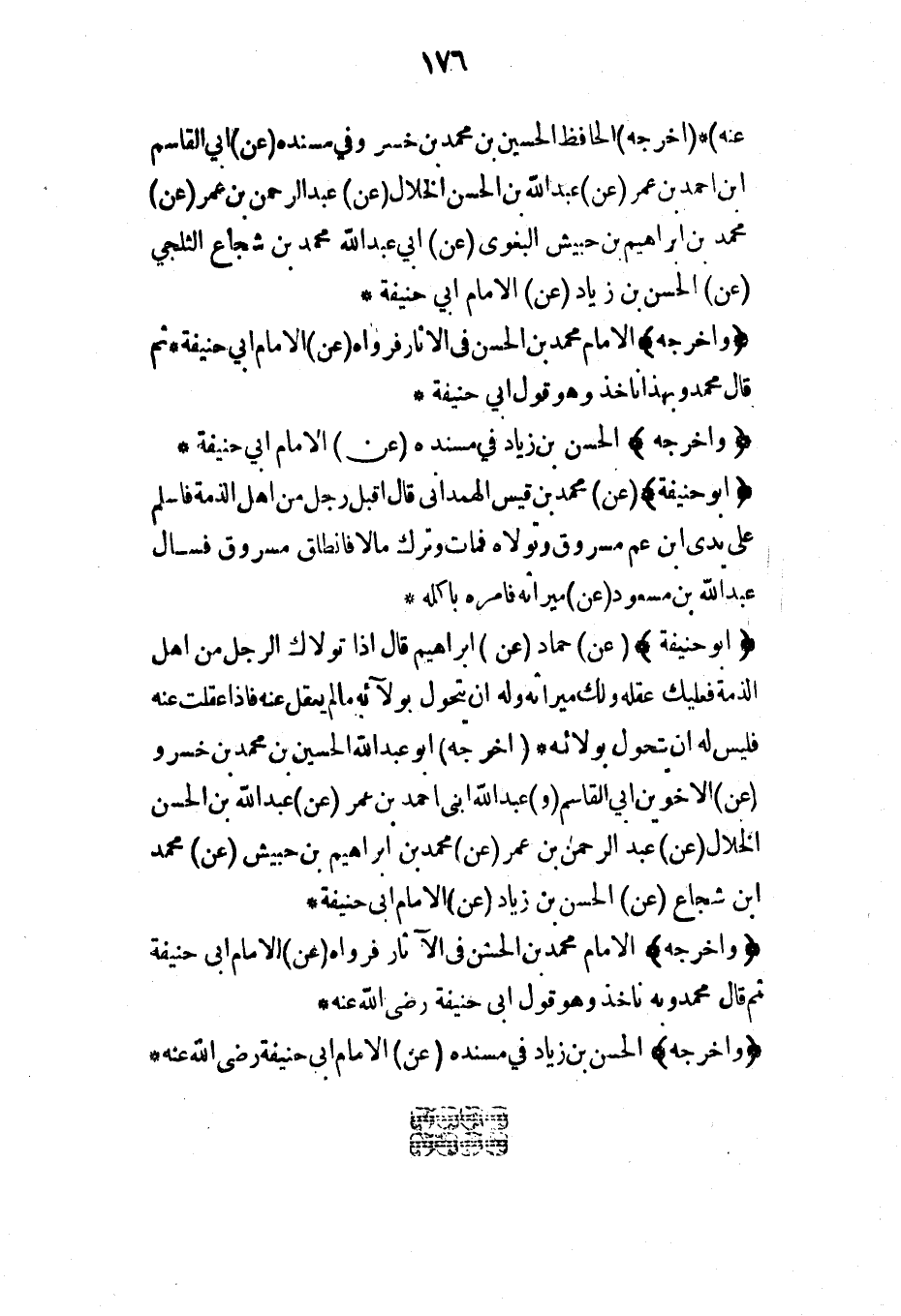 (أبو حنيفة) (عن) حماد (عن) إبراهيم قال إذا تولاك الرجل من أهل الذمة فعليك عقله ولك ميراثه وله أن يتحول بولائه ما لم يعقل عنه فإذا عقلت عنه فليس له أن يتحول بولائه* (أخرجه) أبو عبد الله الحسين بن محمد بن خسرو (عن) الأخوين أبي القاسم (و) عبد الله ابني أحمد بن عمر (عن) عبد الله بن الحسن الخلال (عن) عبد الرحمن بن عمر (عن) محمد بن إبراهيم بن حبيش (عن) محمد ابن شجاع (عن) الحسن بن زياد (عن) الإمام أبي حنيفة*