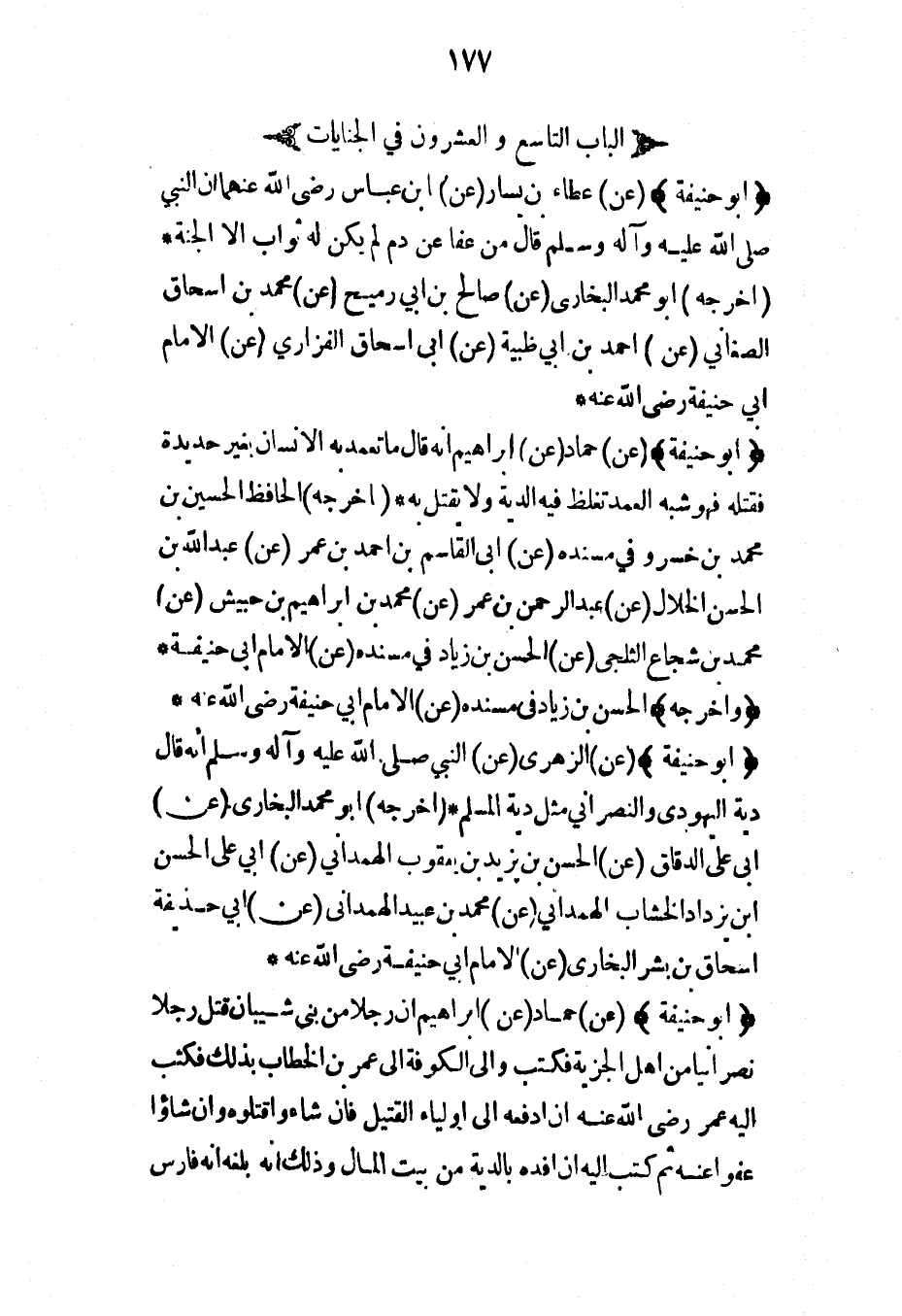(أبو حنيفة) (عن) الزهري (عن) النبي صلى الله عليه وآله وسلم أنه قال دية اليهودي والنصراني مثل دية المسلم* (أخرجه) أبو محمد البخاري (عن) أبي علي الدقاق (عن) الحسن بن يزيد بن يعقوب الهمداني (عن) أبي علي الحسن ابن يزداد الخشاب الهمداني (عن) محمد بن عبيد الهمداني (عن) أبي حذيفة إسحاق بن بشر البخاري (عن) الإمام أبي حنيفة رضي الله عنه*