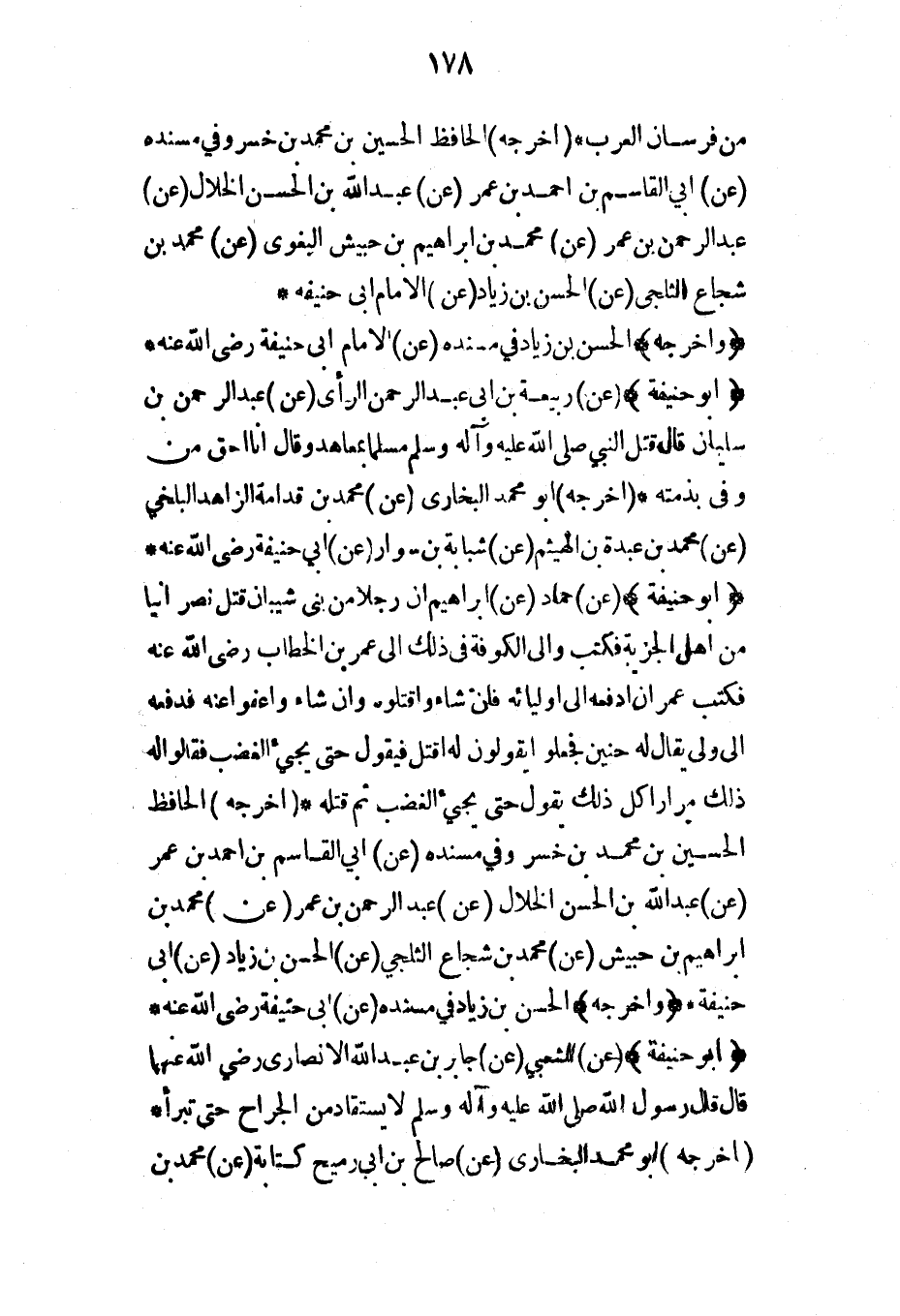 من فرسان العرب* (أخرجه) الحافظ الحسين بن محمد بن خسرو في مسنده (عن) أبي القاسم بن أحمد بن عمر (عن) عبد الله بن الحسن الخلال (عن) عبد الرحمن بن عمر (عن) محمد بن إبراهيم بن حبيش البغوي (عن) محمد بن شجاع الثلجي (عن) الحسن بن زياد (عن) الإمام أبي حنيفة*