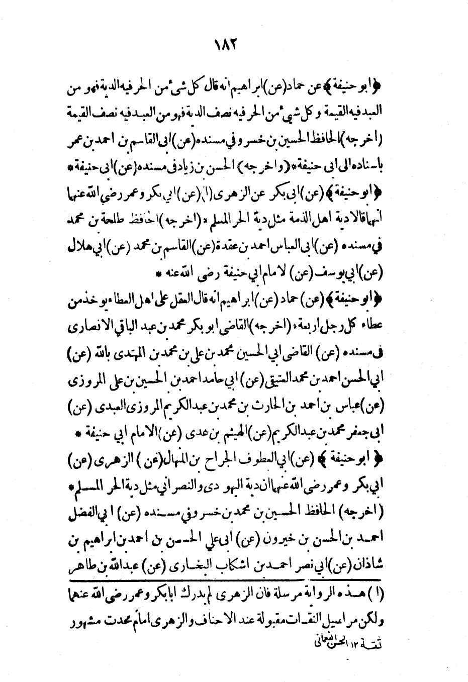 (أبو حنيفة) (عن) أبي العطوف الجراح بن المنهال (عن) الزهري (عن) أبي بكر وعمر رضي الله عنهما أن دية اليهودي والنصراني مثل دية الحر المسلم* (أخرجه) الحافظ الحسين بن محمد بن خسرو في مسنده (عن) أبي الفضل أحمد بن الحسن بن خيرون (عن) أبي علي الحسن بن أحمد بن إبراهيم بن شاذان (عن) أبي نصر أحمد بن اشكاب البخاري (عن) عبد الله بن طاهر