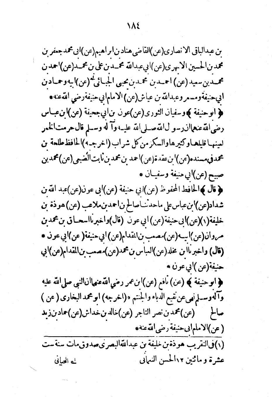 (قال) الحافظ المحفوظ (عن) أبي حنيفة (عن) أبي عون (عن) عبد الله بن شداد (عن) ابن عباس على ما حدثنا صالح بن أحمد بن ملاعب (عن) هوذة بن خليفة (عن) أبي حنيفة (عن) أبي عون (قال) وأخبرنا إسحاق بن محمد بن مروان (عن) أبيه (عن) مصعب بن المقدام (عن) أبي حنيفة (عن) أبي عون* (قال) وأخبرنا ابن مخلد (عن) العباس بن محمد (عن) مصعب بن المقدام (عن) أبي حنيفة (عن) أبي عون*