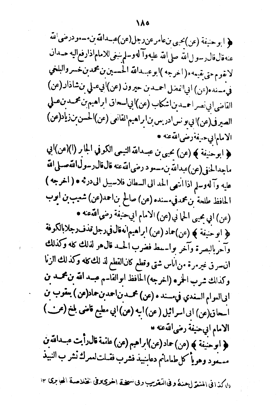 (أبو حنيفة) (عن) يحيى بن عامر عن رجل (عن) عبد الله بن مسعود رضي الله عنه قال قال رسول الله صلى الله عليه وآله وسلم ينبغي للإمام إذا رفع إليه حد أن لا يقوم حتى يقيمه* (أخرجه) أبو عبد الله الحسين بن محمد بن خسرو البلخي في مسنده (عن) أبي الفضل أحمد بن خيرون (عن) أبي علي بن شاذان (عن) القاضي أبي نصر أحمد بن اشكاب (عن) أبي إسحاق إبراهيم بن محمد بن علي الصيرفي (عن) أبي يونس إدريس بن إبراهيم المقانعي (عن) الحسن بن زياد (عن) الإمام أبي حنيفة رضي الله عنه*