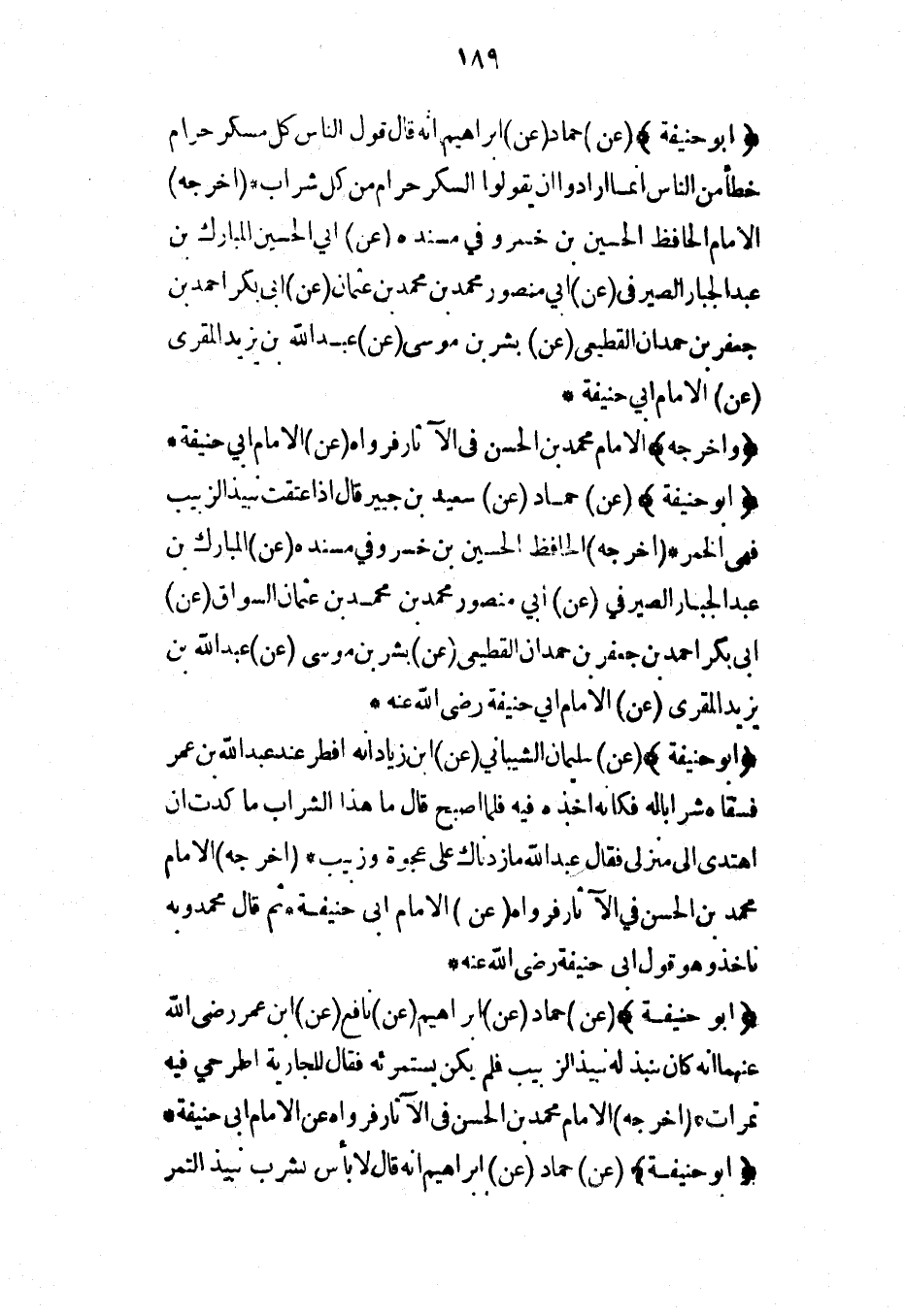 (أبو حنيفة) (عن) حماد (عن) إبراهيم أنه قال قول الناس كل مسكر حرام خطأ من الناس إنما أرادوا أن يقولوا السكر حرام من كل شراب* (أخرجه) الإمام الحافظ الحسين بن خسرو في مسنده (عن) أبي الحسين المبارك بن عبد الجبار الصيرفي (عن) أبي منصور محمد بن محمد بن عثمان (عن) أبي بكر أحمد بن جعفر بن حمدان القطيعي (عن) بشر بن موسى (عن) عبد الله بن يزيد المقري (عن) الإمام أبي حنيفة*