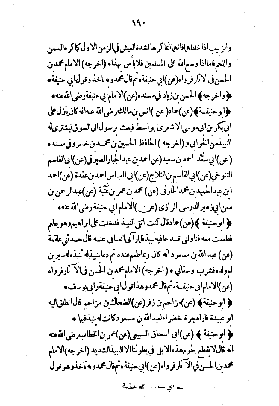 (أبو حنيفة) (عن) حماد قال كنت أتقي النبيذ فدخلت على إبراهيم وهو يطعم فطعمت معه فناولني قدحاً فيه نبيذ فلما رآني أتعافى عنه قال حدثني علقمة (عن) عبد الله بن مسعود أنه كان ربما طعم عنده ثم دعا بنبيذ له تنبذه له سيرين أم ولده فشرب وسقاني* (أخرجه) الإمام محمد بن الحسن في الآثار فرواه (عن) الإمام أبي حنيفة* ثم قال محمد وهذا قول أبي حنيفة وأبي يوسف*