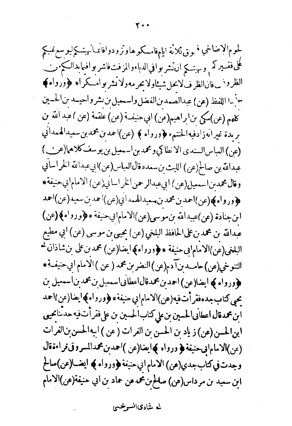 لحوم الأضاحي فوق ثلاثة أيام فامسكوها وتزودوا فإنما نهيتكم ليوسع غنيكم على فقيركم ونهيتكم أن تشربوا في الدباء والمزفت فاشربوا فيما بدا لكم من الظروف فإن الظرف لا يحل شيئاً ولا يحرمه ولا تشربوا مسكراً* (ورواه) بهذا اللفظ (عن) عبد الصمد بن الفضل وإسماعيل بن بشر وأحيد بن الحسين كلهم (عن) مكي بن إبراهيم (عن) أبي حنيفة (عن) علقمة (عن) عبد الله بن بريدة غير أنه زاد فيه الحنتم* (ورواه) (عن) أحمد بن محمد بن سعيد الهمداني (عن) العباس السغدي الأنطاكي ومحمد بن إسماعيل بن يوسف كلاهما (عن) عبد الله بن صالح (عن) الليث بن سعد* قال العباس (عن) أبي عبد الله الخراساني وقال محمد بن إسماعيل (عن) أبي عبد الرحمن الخراساني (عن) الإمام أبي حنيفة* (ورواه) (عن) أحمد بن محمد بن سعيد الهمداني (عن) أحمد بن سعيد (عن) أحمد ابن جنادة (عن) عبيد الله بن موسى (عن) الإمام أبي حنيفة* (ورواه) (عن) عبد الله بن محمد بن علي الحافظ البلخي (عن) يحيى بن موسى (عن) أبي مطيع البلخي (عن) الإمام أبي حنيفة* (ورواه) أيضاً (عن) محمد بن علي بن شاذان التنوخي (عن) حامد بن آدم (عن) النضر بن محمد (عن) الإمام أبي حنيفة* (ورواه) أيضاً (عن) أحمد بن محمد قال أعطاني إسماعيل بن محمد بن إسماعيل بن يحيى كتاب جده فقرأت فيه (عن) الإمام أبي حنيفة* (ورواه) أيضاً (عن) أحمد ابن محمد قال أعطاني الحسين بن علي كتاب الحسين بن علي فقرأت فيه حدثنا يحيى ابن الحسن (عن) زياد بن الحسن بن الفرات (عن) أبيه الحسن بن الفرات (عن) الإمام أبي حنيفة (ورواه) أيضاً (عن) أحمد بن محمد المسروقي قراءة قال وجدت في كتاب جدي (عن) الإمام أبي حنيفة (ورواه) أيضاً (عن) صالح ابن سعيد بن مرداس (عن) صالح بن محمد عن حماد بن أبي حنيفة (عن) الإمام