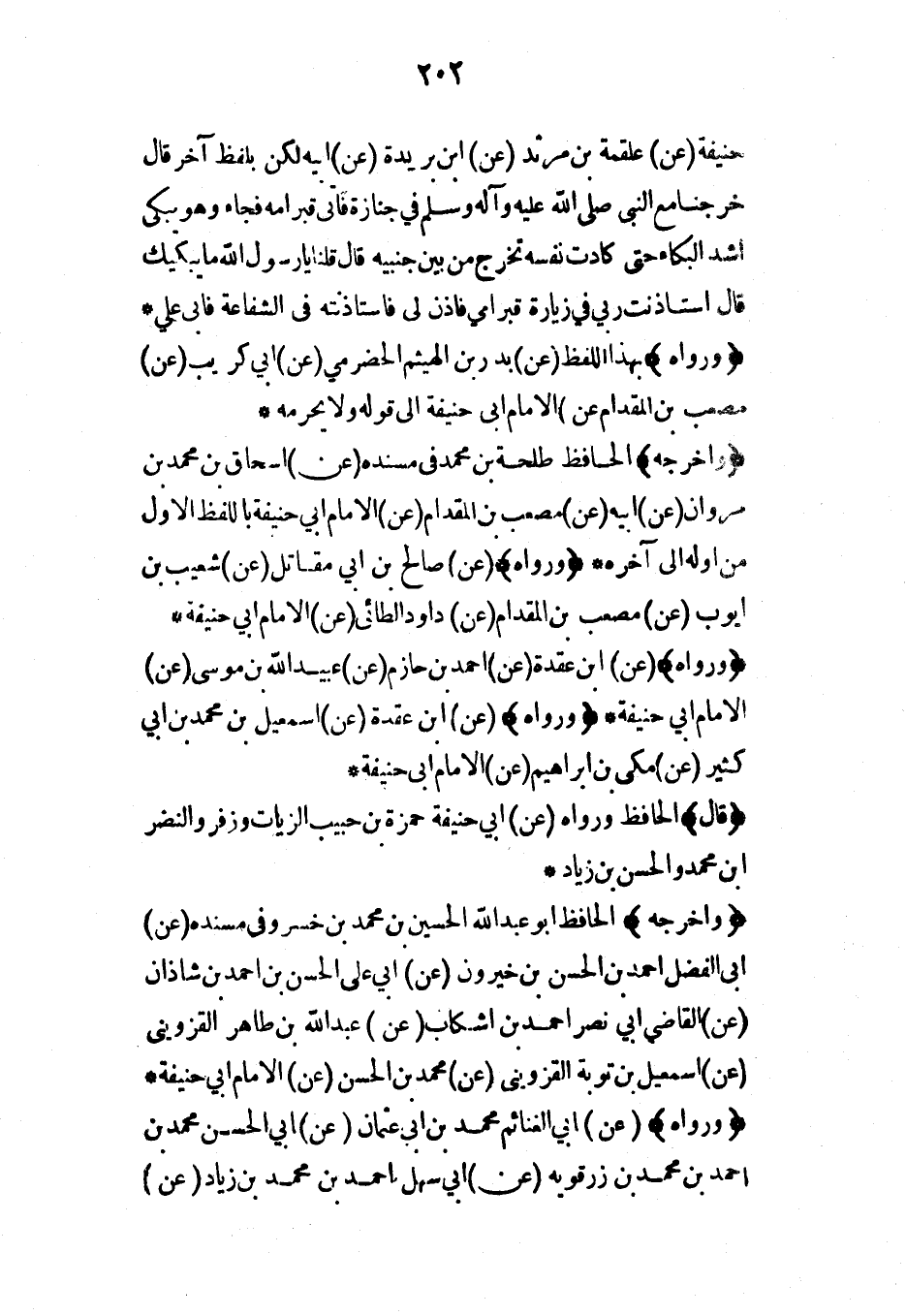 (وأخرجه) الحافظ أبو عبد الله الحسين بن محمد بن خسرو في مسنده (عن) أبي الفضل أحمد بن الحسن بن خيرون (عن) أبي علي الحسن بن أحمد بن شاذان (عن) القاضي أبي نصر أحمد بن اشكاب (عن) عبد الله بن طاهر القزويني (عن) إسماعيل بن توبة القزويني (عن) محمد بن الحسن (عن) الإمام أبي حنيفة* (ورواه) (عن) أبي الغنائم محمد بن أبي عثمان (عن) أبي الحسن محمد بن أحمد بن محمد بن زرقويه (عن) أبي سهل أحمد بن محمد بن زياد (عن)
