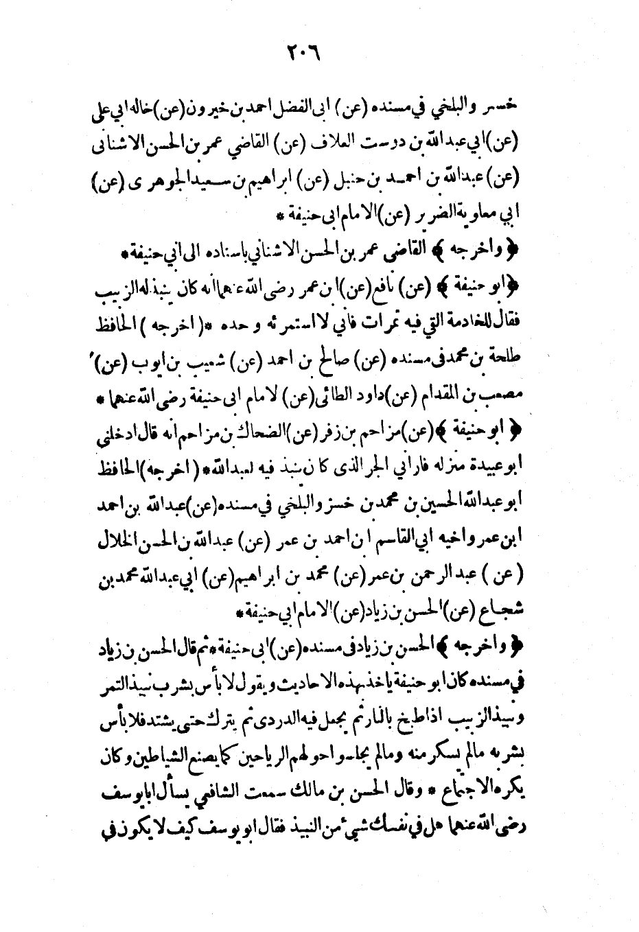 خسرو البلخي في مسنده (عن) أبي الفضل أحمد بن خيرون (عن) خاله أبي علي (عن) أبي عبد الله بن دوست العلاف (عن) القاضي عمر بن الحسن الأشناني (عن) عبد الله بن أحمد بن حنبل (عن) إبراهيم بن سعيد الجوهري (عن) أبي معاوية الضرير (عن) الإمام أبي حنيفة*