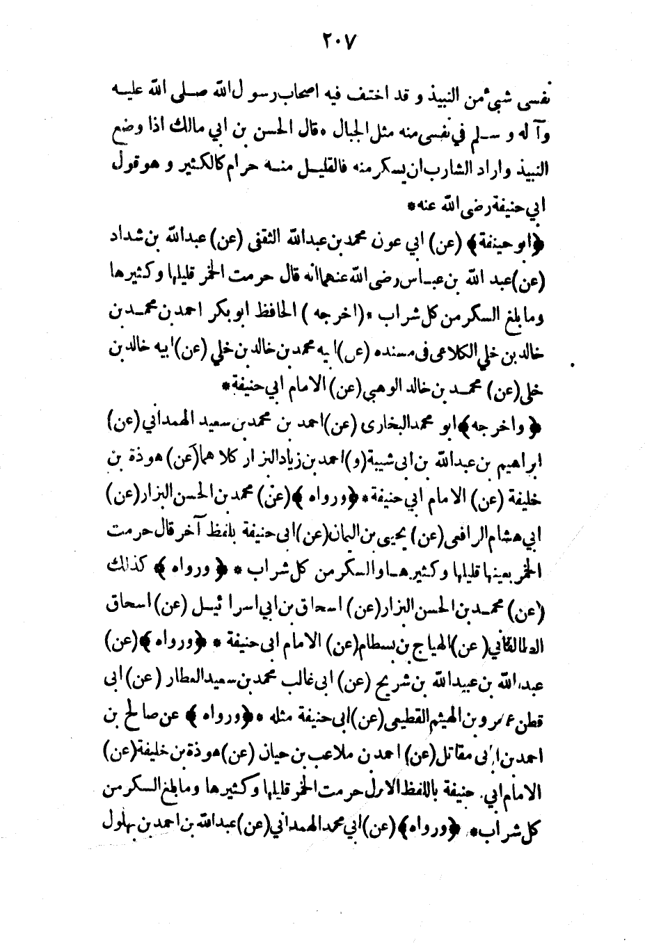 (وأخرجه) أبو محمد البخاري (عن) أحمد بن محمد بن سعيد الهمداني (عن) إبراهيم بن عبد الله بن أبي شيبة (و) أحمد بن زياد البزار كلاهما (عن) هوذة بن خليفة (عن) الإمام أبي حنيفة* (ورواه) (عن) محمد بن الحسن البزار (عن) أبي هشام الرافعي (عن) يحيى بن اليمان (عن) أبي حنيفة بلفظ آخر قال حرمت الخمر بعينها قليلها وكثيرها والسكر من كل شراب* (ورواه) كذلك (عن) محمد بن الحسن البزار (عن) إسحاق بن أبي إسرائيل (عن) إسحاق الطالقاني (عن) الهياج بن بسطام (عن) الإمام أبي حنيفة* (ورواه) (عن) عبد الله بن عبيد الله بن شريح (عن) أبي غالب محمد بن سعيد العطار (عن) أبي قطن عمرو بن الهيثم القطيعي (عن) أبي حنيفة مثله* (ورواه) (عن صالح بن أحمد بن أبي مقاتل (عن) أحمد بن ملاعب بن حيان (عن) هوذة بن خليفة (عن) الإمام أبي حنيفة باللفظ الأول حرمت الخمر قليلها وكثيرها وما بلغ السكر من كل شراب* (ورواه) (عن) أبي محمد الهمداني (عن) عبد الله بن أحمد بن بهلول