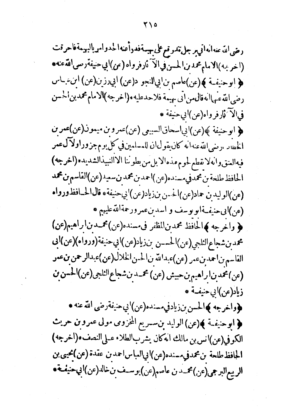 (وأخرجه) الحافظ محمد بن المظفر في مسنده (عن) محمد بن إبراهيم (عن) محمد بن شجاع الثلجي (عن) الحسن بن زياد (عن) أبي حنيفة (ورواه) (عن) أبي القاسم بن أحمد بن عمر (عن) عبد الله بن الحسن الخلال (عن) عبد الرحمن بن عمر (عن) محمد بن إبراهيم بن حبيش (عن) محمد بن شجاع الثلجي (عن) الحسن بن زياد (عن) أبي حنيفة*