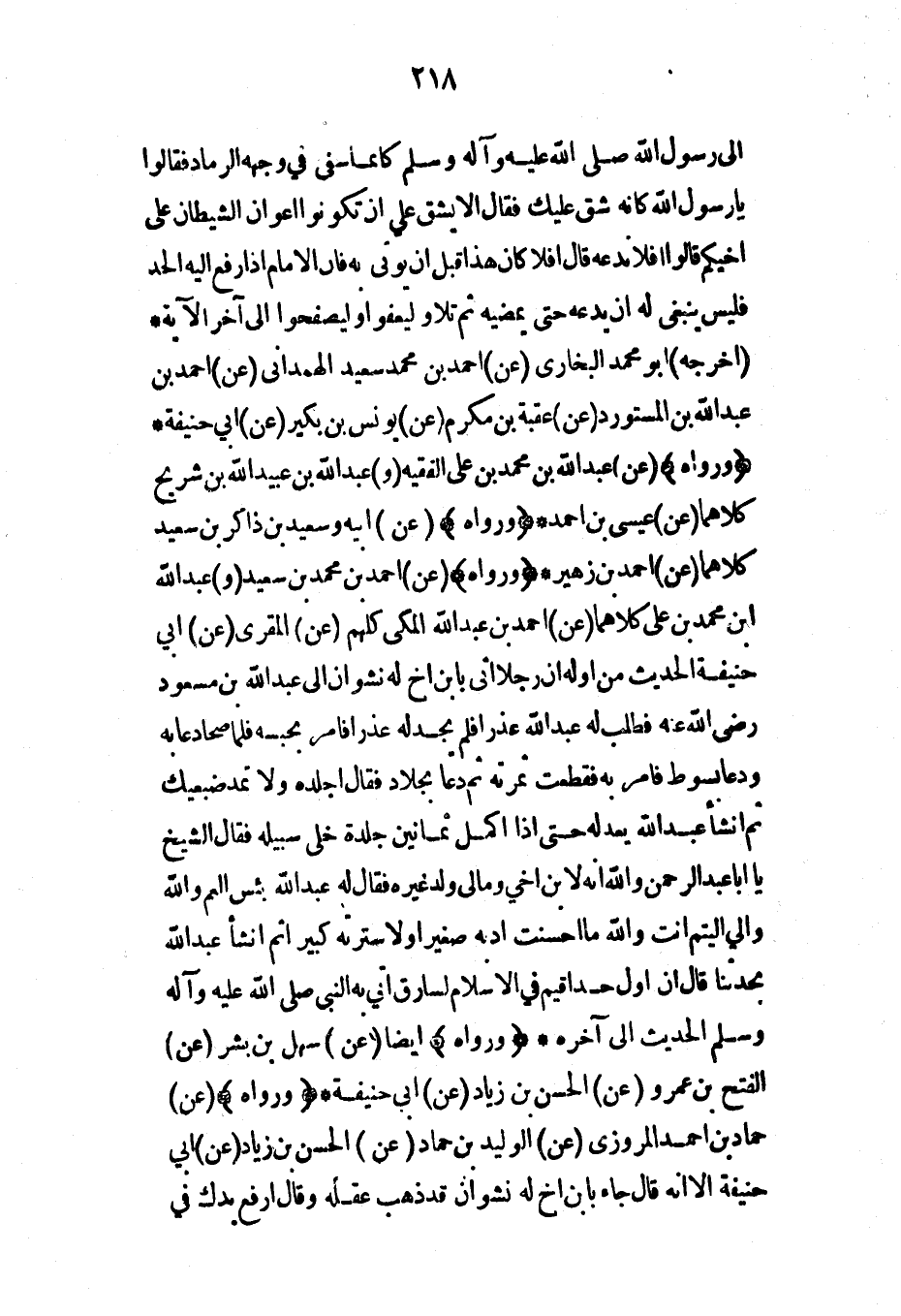 إلى رسول الله صلى الله عليه وآله وسلم كأنما سفى في وجهه الرماد فقالوا يا رسول الله كأنه شق عليك فقال ألا يشق علي أن تكونوا أعوان الشيطان على أخيكم قالوا أفلا تدعه قال أفلا كان هذا قبل أن يؤتى به فإن الإمام إذا رفع إليه الحد فليس ينبغي له أن يدعه حتى يمضيه ثم تلا {وليعفوا وليصفحوا} إلى آخر الآية* (أخرجه) أبو محمد البخاري (عن) أحمد بن محمد سعيد الهمداني (عن) أحمد بن عبد الله بن المستورد (عن) عقبة بن مكرم (عن) يونس بن بكير (عن) أبي حنيفة* (ورواه) (عن) عبد الله بن محمد بن علي الفقيه (و) عبد الله بن عبيد الله بن شريح كلاهما (عن) عيسى بن أحمد* (ورواه) (عن) أبيه وسعيد بن ذاكر بن سعيد كلاهما (عن) أحمد بن زهير* (ورواه) (عن) أحمد بن محمد بن سعيد (و) عبد الله ابن محمد بن علي كلاهما (عن) أحمد بن عبد الله المكي كلهم (عن) المقري (عن) أبي حنيفة الحديث من أوله أن رجلاً أتى بابن أخ له نشوان إلى عبد الله بن مسعود رضي الله عنه فطلب له عبد الله عذراً فلم يجد له عذراً فأمر بحبسه فلما صحا دعا به ودعا بسوط فأمر به فقطعت ثمرته ثم دعا بجلاد فقال اجلده ولا تمد ضبعيك ثم أنشأ عبد الله يعد له حتى إذا أكمل ثمانين جلدة خلى سبيله فقال الشيخ يا أبا عبد الرحمن والله إنه لابن أخي ومالي ولد غيره فقال له عبد الله بئس العم والله والي اليتيم أنت والله ما أحسنت أدبه صغيراً ولا سترته كبيراً ثم أنشأ عبد الله يحدثنا قال إن أول حد أقيم في الإسلام لسارق أتي به النبي صلى الله عليه وآله وسلم الحديث إلى آخره* (ورواه) أيضاً (عن) سهل بن بشر (عن) الفتح بن عمرو (عن) الحسن بن زياد (عن) أبي حنيفة* (ورواه) (عن) حماد بن أحمد المروزي (عن) الوليد بن حماد (عن) الحسن بن زياد (عن) أبي حنيفة إلا أنه قال جاء بابن أخ له نشوان قد ذهب عقله وقال ارفع يدك في