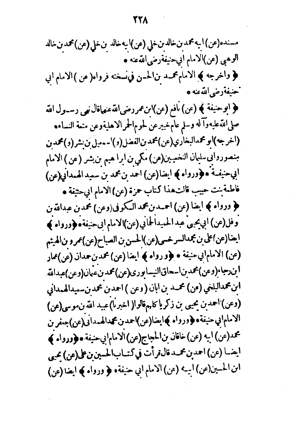 (ورواه) أيضاً (عن) أحمد بن محمد الكوفي (وعن) محمد بن عبد الله بن نوفل (عن) أبي يحيى عبد الحميد الحماني (عن) الإمام أبي حنيفة* (ورواه) أيضاً (عن) علي بن محمد السرخسي (عن) الحسن بن الصباح (عن) عمرو بن الهيثم (عن) الإمام أبي حنيفة* (ورواه) أيضاً (عن) محمد بن حمدان (عن) عمار ابن رجاء (عن) محمد بن إسحاق النيسابوري (عن) محمد بن عثمان (وعن) عبد الله ابن محمد البلخي (عن) محمد بن أبان (وعن) أحمد بن محمد بن سعيد الهمداني (وعن) أحمد بن يحيى بن زكريا كلهم قالوا (أخبرنا) عبيد الله بن موسى (عن) الإمام أبي حنيفة* (ورواه) أيضاً (عن) أحمد بن محمد الهمداني (عن) جعفر بن محمد (عن) أبيه خاقان بن الحجاج (عن) الإمام أبي حنيفة* (ورواه) أيضاً (عن) أحمد بن محمد قال قرأت في كتاب الحسين بن علي (عن) يحيى ابن الحسين (عن) أبيه (عن) الإمام أبي حنيفة* (ورواه) أيضاً (عن)