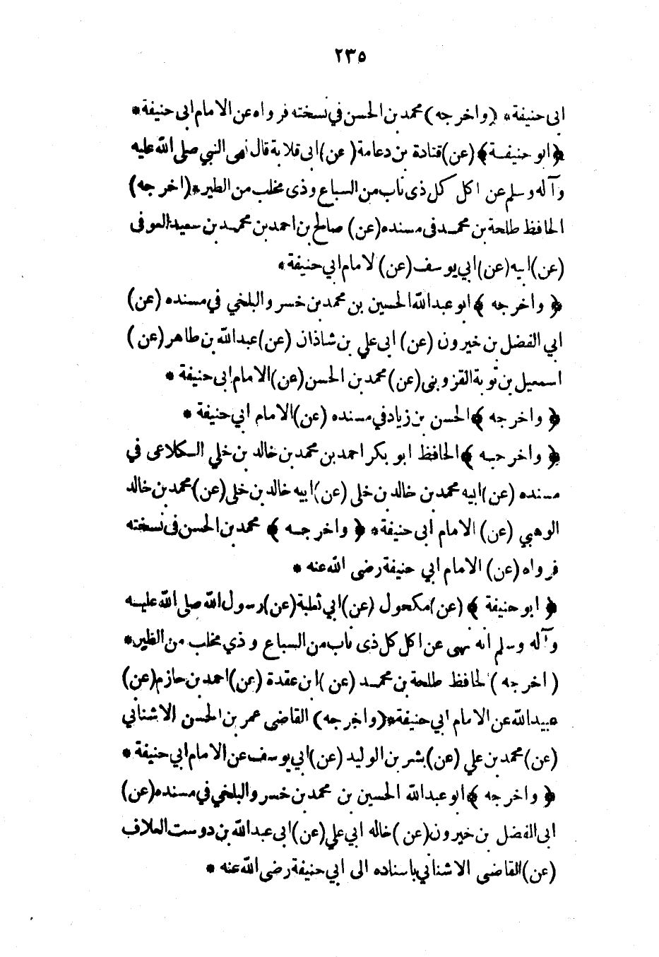 (أبو حنيفة) (عن) مكحول (عن) أبي ثعلبة (عن) رسول الله صلى الله عليه وآله وسلم أنه نهى عن أكل كل ذي ناب من السباع وذي مخلب من الطير* (أخرجه) الحافظ طلحة بن محمد (عن) ابن عقدة (عن) أحمد بن حازم (عن) عبيد الله عن الإمام أبي حنيفة* (وأخرجه) القاضي عمر بن الحسن الأشناني (عن) محمد بن علي (عن) بشر بن الوليد (عن) أبي يوسف عن الإمام أبي حنيفة*