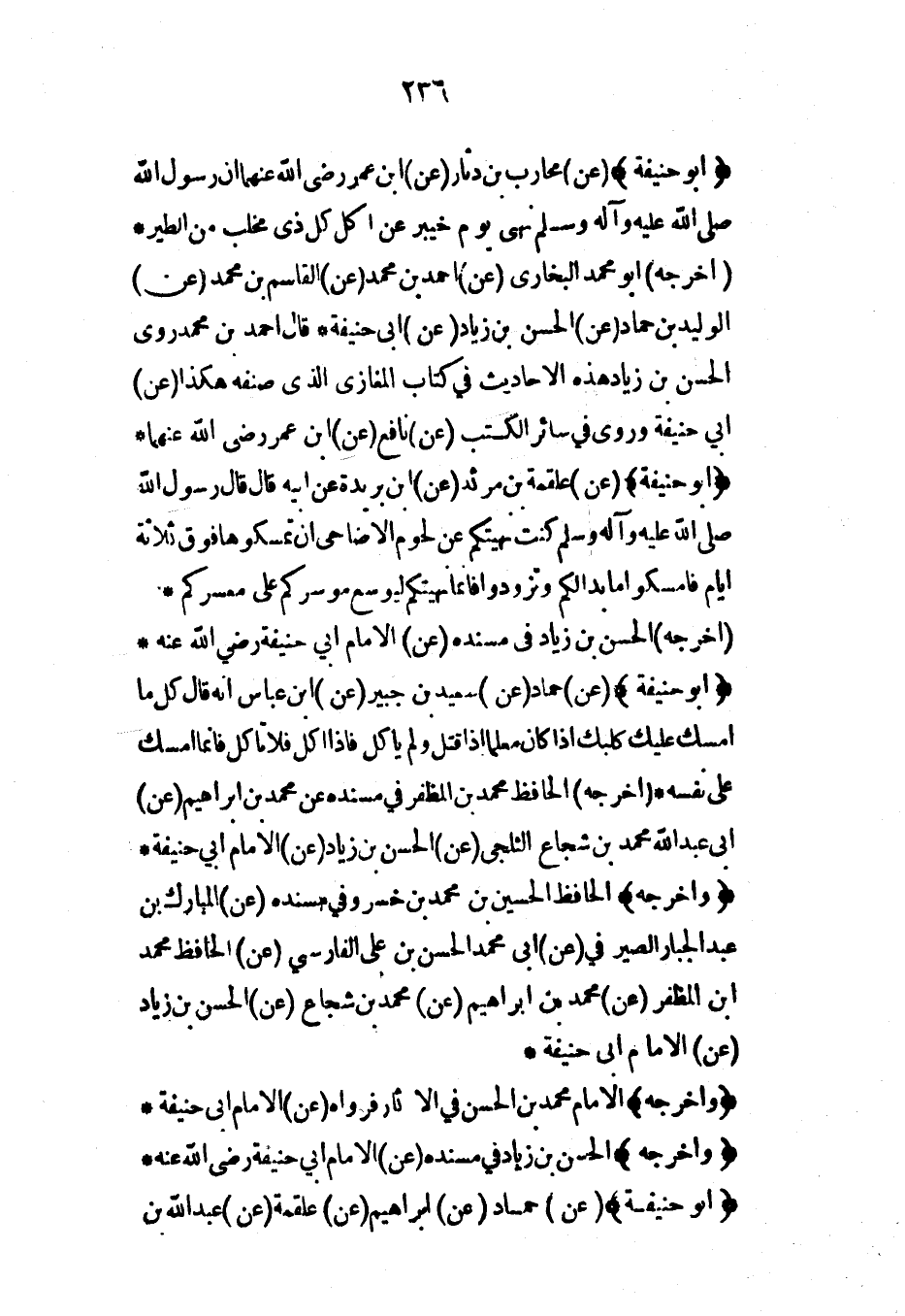 (وأخرجه) الحافظ الحسين بن محمد بن خسرو في مسنده (عن) المبارك بن عبد الجبار الصيرفي (عن) أبي محمد الحسن بن علي الفارسي (عن) الحافظ محمد ابن المظفر (عن) محمد بن إبراهيم (عن) محمد بن شجاع (عن) الحسن بن زياد (عن) الإمام أبي حنيفة*