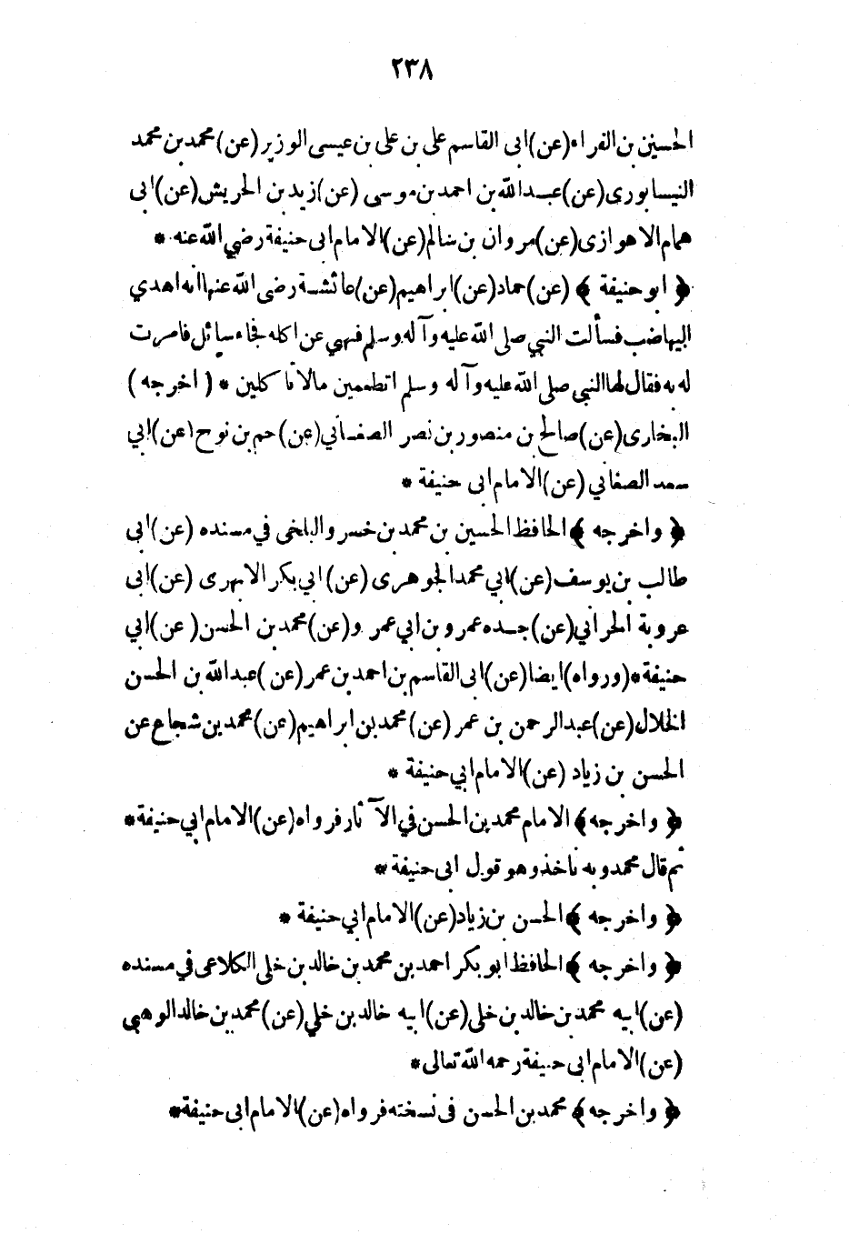 (وأخرجه) الحافظ الحسين بن محمد بن خسرو البلخي في مسنده (عن) أبي طالب بن يوسف (عن) أبي محمد الجوهري (عن) أبي بكر الأبهري (عن) أبي عروبة الحراني (عن) جده عمرو بن أبي عمرو (عن) محمد بن الحسن (عن) أبي حنيفة* (ورواه) أيضاً (عن) أبي القاسم بن أحمد بن عمر (عن) عبد الله بن الحسن الخلال (عن) عبد الرحمن بن عمر (عن) محمد بن إبراهيم (عن) محمد بن شجاع عن الحسن بن زياد (عن) الإمام أبي حنيفة*