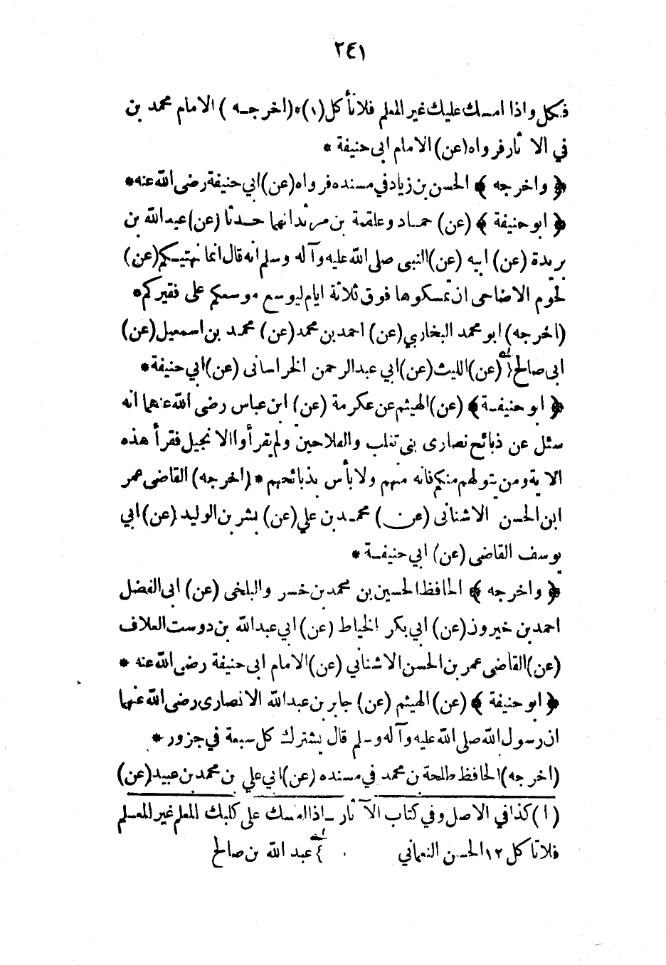 (أخرجه) أبو محمد البخاري (عن) أحمد بن محمد (عن) محمد بن إسماعيل (عن) أبي صالح (عن) الليث (عن) أبي عبد الرحمن الخراساني (عن) أبي حنيفة*
