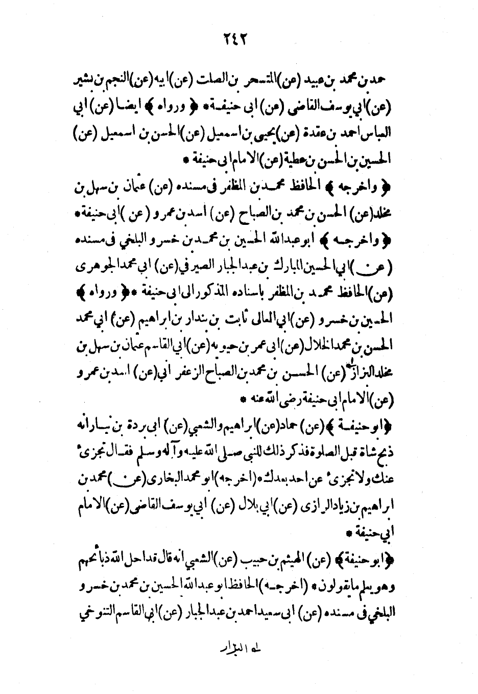 حمد بن محمد بن عبيد (عن) المتسحر بن الصلت (عن) أبيه (عن) النجم بن بشير (عن) أبي يوسف القاضي (عن) أبي حنيفة* (ورواه) أيضاً (عن) أبي العباس أحمد بن عقدة (عن) يحيى بن إسماعيل (عن) الحسن بن إسماعيل (عن) الحسين بن الحسن بن عطية (عن) الإمام أبي حنيفة*