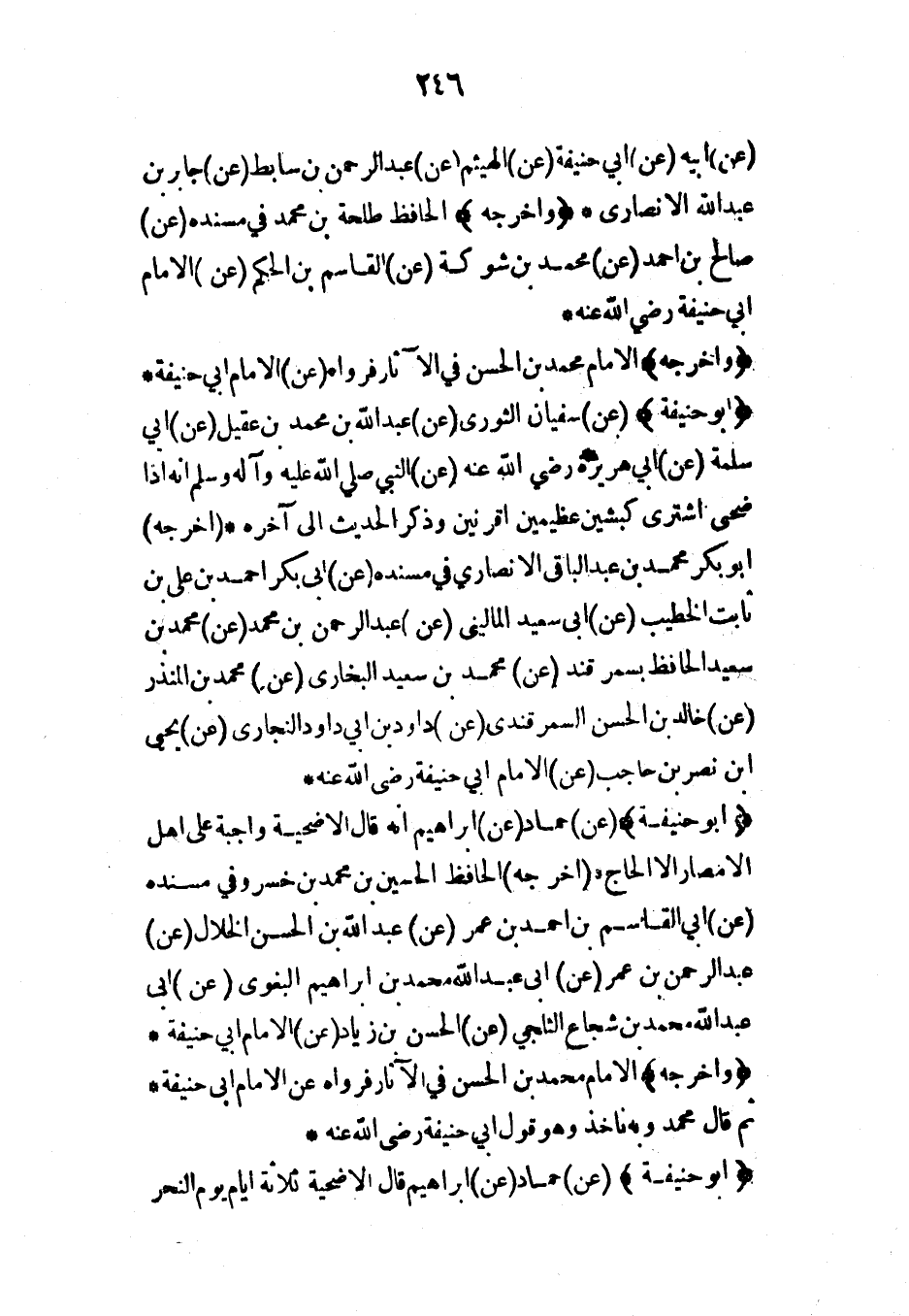 (أبو حنيفة) (عن) حماد (عن) إبراهيم أنه قال الأضحية واجبة على أهل الأمصار إلا الحاج* (أخرجه) الحافظ الحسين بن محمد بن خسرو في مسنده (عن) أبي القاسم بن أحمد بن عمر (عن) عبد الله بن الحسن الخلال (عن) عبد الرحمن بن عمر (عن) أبي عبد الله محمد بن إبراهيم البغوي (عن) أبي عبد الله محمد بن شجاع الثلجي (عن) الحسن بن زياد (عن) الإمام أبي حنيفة*