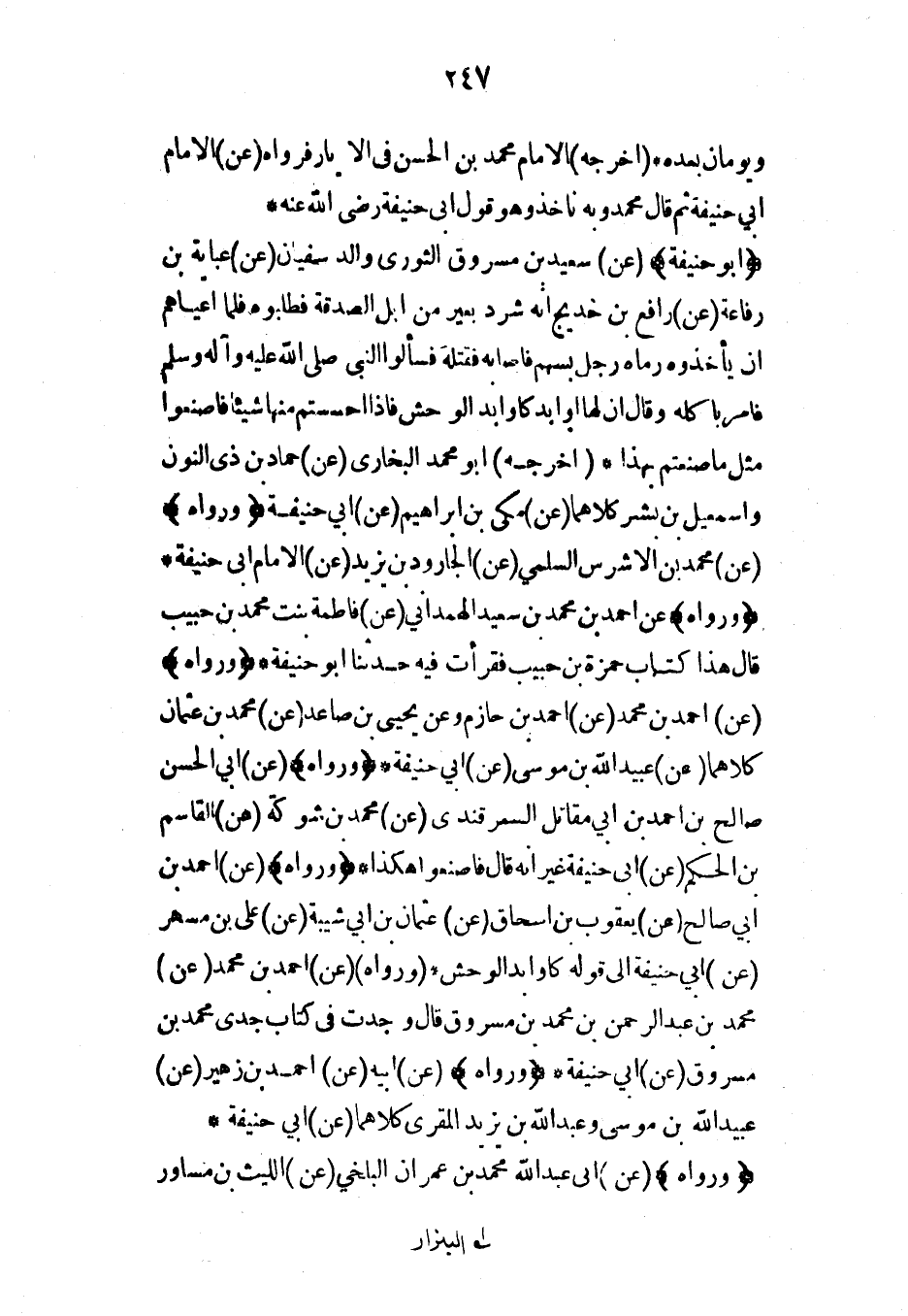 (أبو حنيفة) (عن) سعيد بن مسروق الثوري والد سفيان (عن) عباية بن رفاعة (عن) رافع بن خديج أنه شرد بعير من إبل الصدقة فطلبوه فلما أعياهم أن يأخذوه رماه رجل بسهم فأصابه فقتله فسألوا النبي صلى الله عليه وآله وسلم فأمر بأكله وقال إن لها أوابد كأوابد الوحش فإذا أحسستم منها شيئاً فاصنعوا مثل ما صنعتم بهذا* (أخرجه) أبو محمد البخاري (عن) حماد بن ذي النون وإسماعيل بن بشر كلاهما (عن) مكي بن إبراهيم (عن) أبي حنيفة (ورواه) (عن) محمد بن الأشرس السلمي (عن) الجارود بن يزيد (عن) الإمام أبي حنيفة* (ورواه) عن أحمد بن محمد بن سعيد الهمداني (عن) فاطمة بنت محمد بن حبيب قال هذا كتاب حمزة بن حبيب فقرأت فيه حدثنا أبو حنيفة* (ورواه) (عن) أحمد بن محمد (عن) أحمد بن حازم وعن يحيى بن صاعد (عن) محمد بن عثمان كلاهما (عن) عبيد الله بن موسى (عن) أبي حنيفة* (ورواه) (عن) أبي الحسن صالح بن أحمد بن أبي مقاتل السمرقندي (عن) محمد بن شوكة (عن) القاسم بن الحكم (عن) أبي حنيفة غير أنه قال فاصنعوا هكذا* (ورواه) (عن) أحمد بن أبي صالح (عن) يعقوب بن إسحاق (عن) عثمان بن أبي شيبة (عن) علي بن مسهر (عن) أبي حنيفة إلى قوله كأوابد الوحش* (ورواه) (عن) أحمد بن محمد (عن) محمد بن عبد الرحمن بن محمد بن مسروق قال وجدت في كتاب جدي محمد بن مسروق (عن) أبي حنيفة* (ورواه) (عن) أبيه (عن) أحمد بن زهير (عن) عبيد الله بن موسى وعبد الله بن يزيد المقري كلاهما (عن) أبي حنيفة*