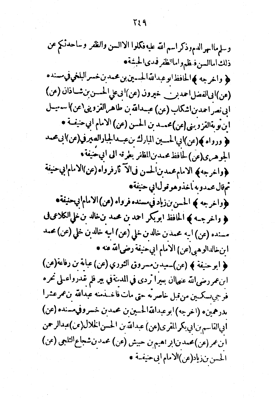(أبو حنيفة) (عن) سعيد بن مسروق الثوري (عن) عباية بن رفاعة (عن) ابن عمر رضي الله عنهما أن بعيراً تردى في المدينة في بير فلم يقدروا على نحره فوجي بسكين من قبل خاصرته حتى مات فأخذ منه عبد الله بن عمر عشراً بدرهمين* (أخرجه) أبو عبد الله الحسين بن محمد بن خسرو في مسنده (عن) أبي القاسم بن أبي بكر المقري (عن) عبد الله بن الحسن الخلال (عن) عبد الرحمن ابن عمر (عن) محمد بن إبراهيم بن حبيش (عن) محمد بن شجاع الثلجي (عن) الحسن بن زياد (عن) الإمام أبي حنيفة*