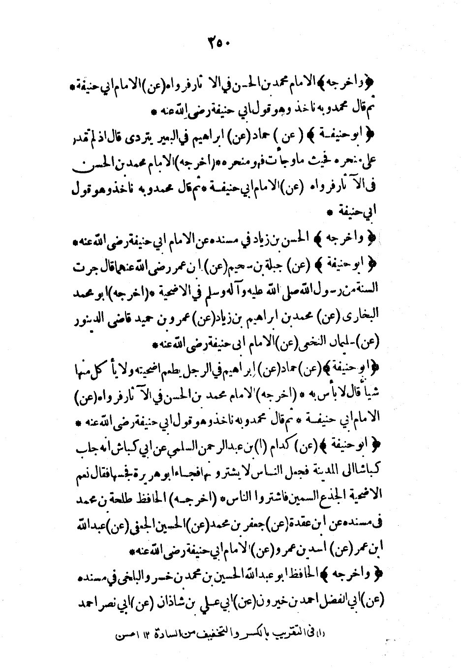 (أبو حنيفة) (عن) جبلة بن سحيم (عن) ابن عمر رضي الله عنهما قال جرت السنة من رسول الله صلى الله عليه وآله وسلم في الأضحية* (أخرجه) أبو محمد البخاري (عن) محمد بن إبراهيم بن زياد (عن) عمرو بن حميد قاضي الدينور (عن) سليمان النخعي (عن) الإمام أبي حنيفة رضي الله عنه*